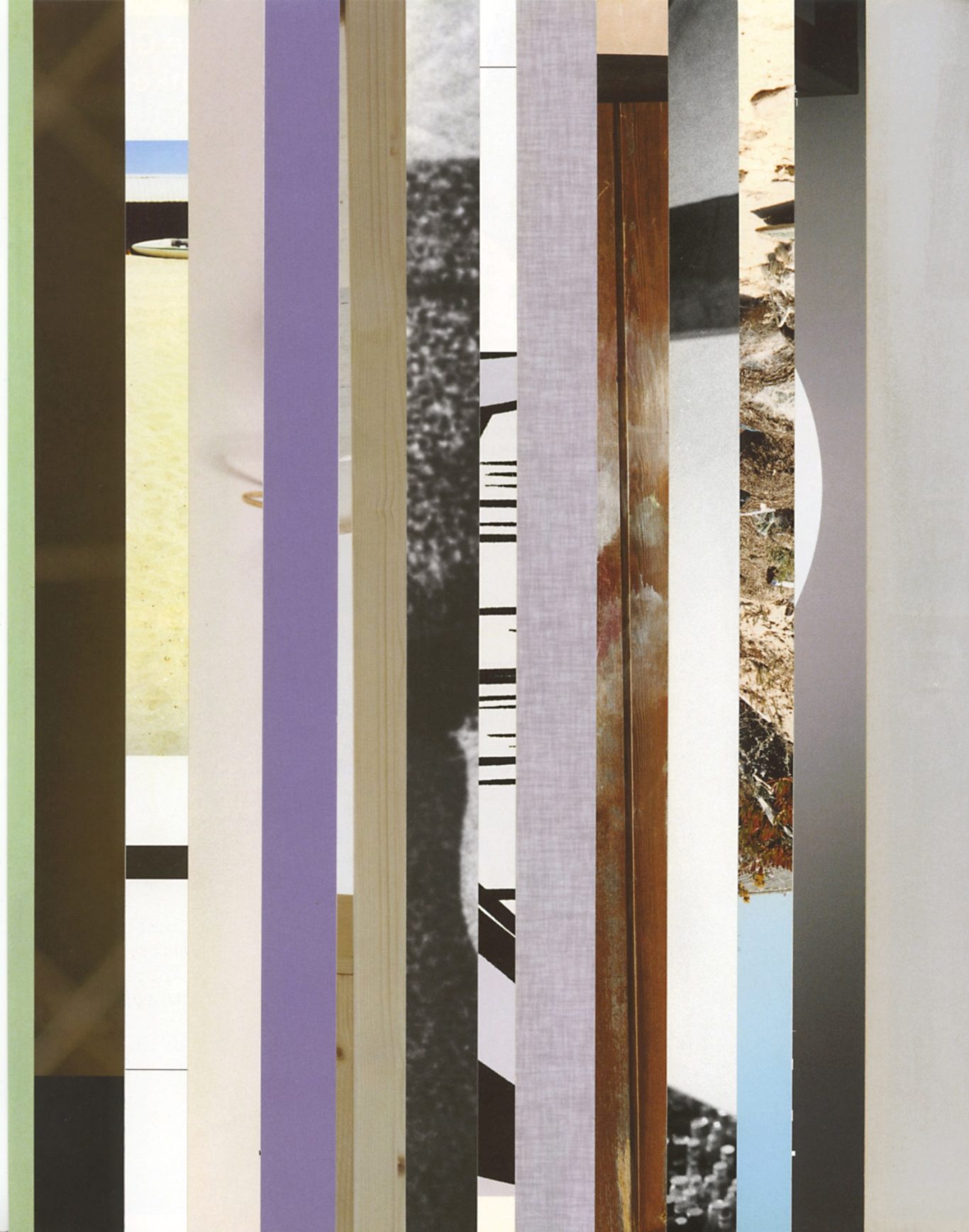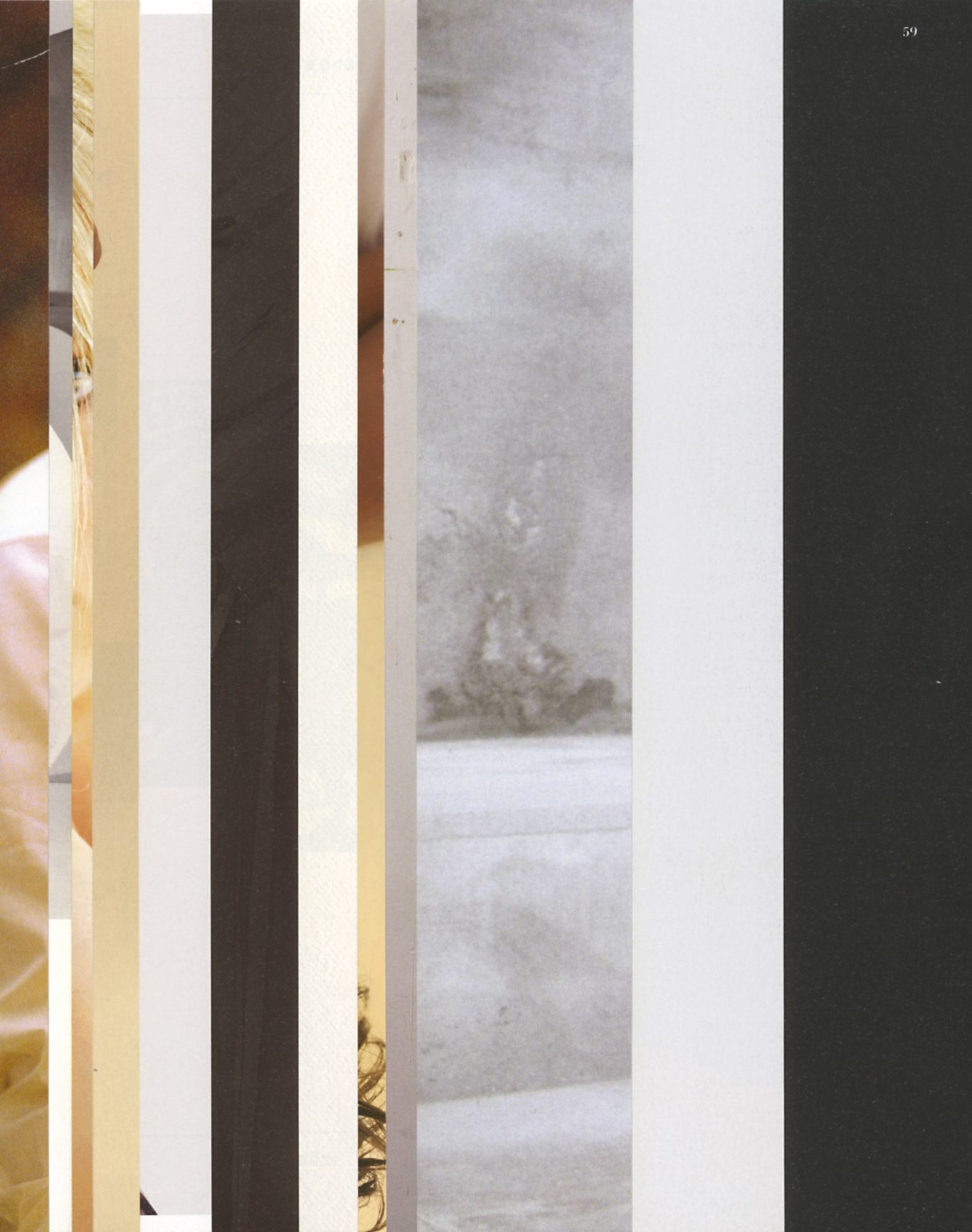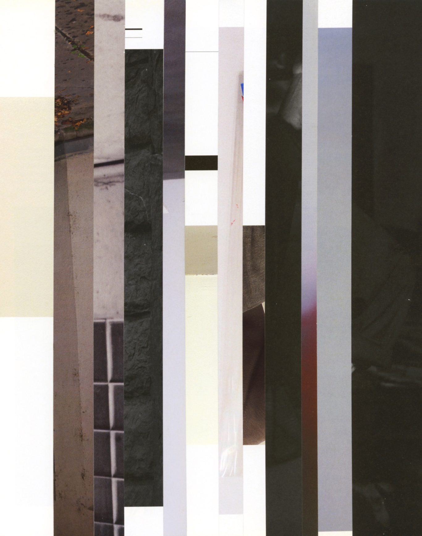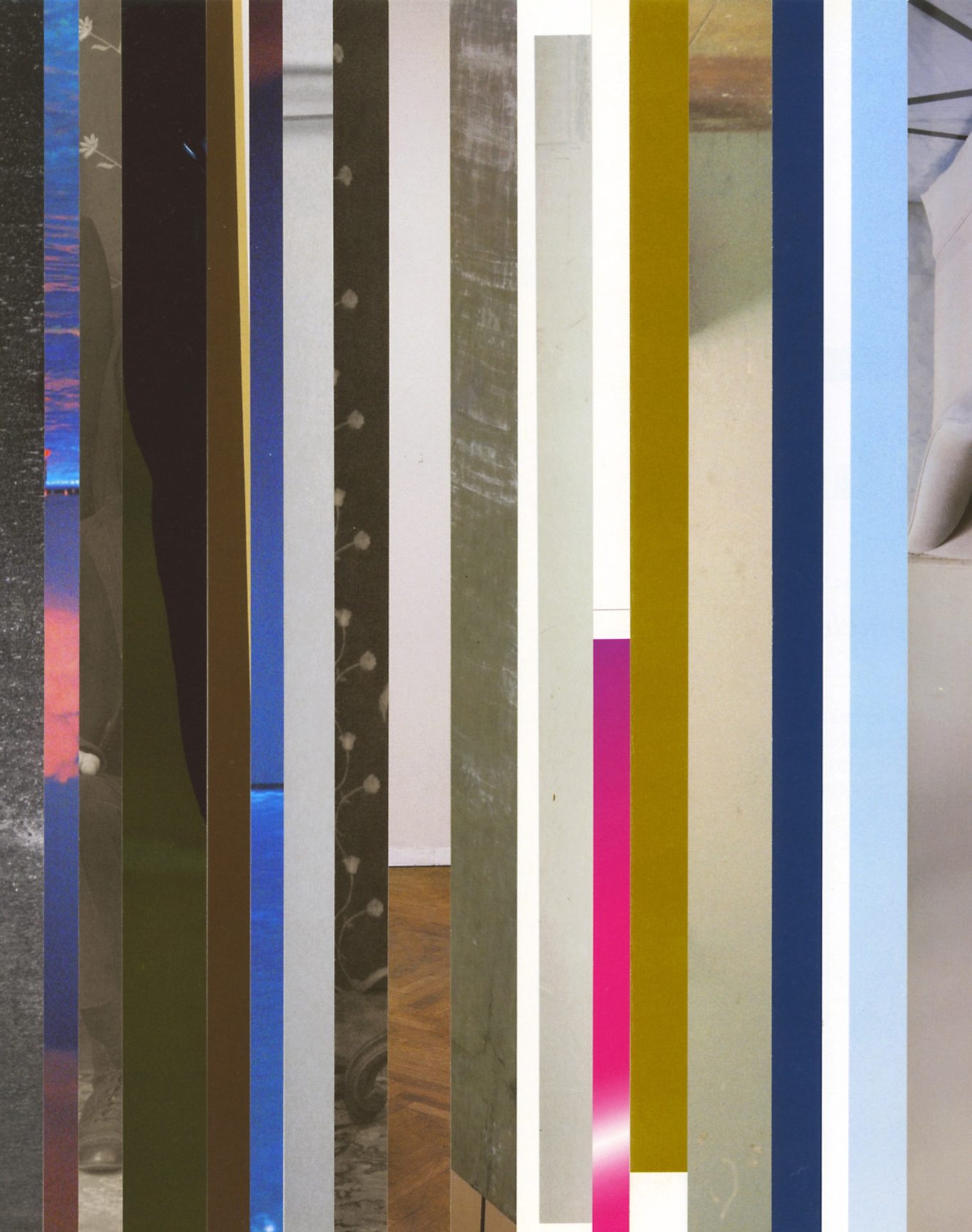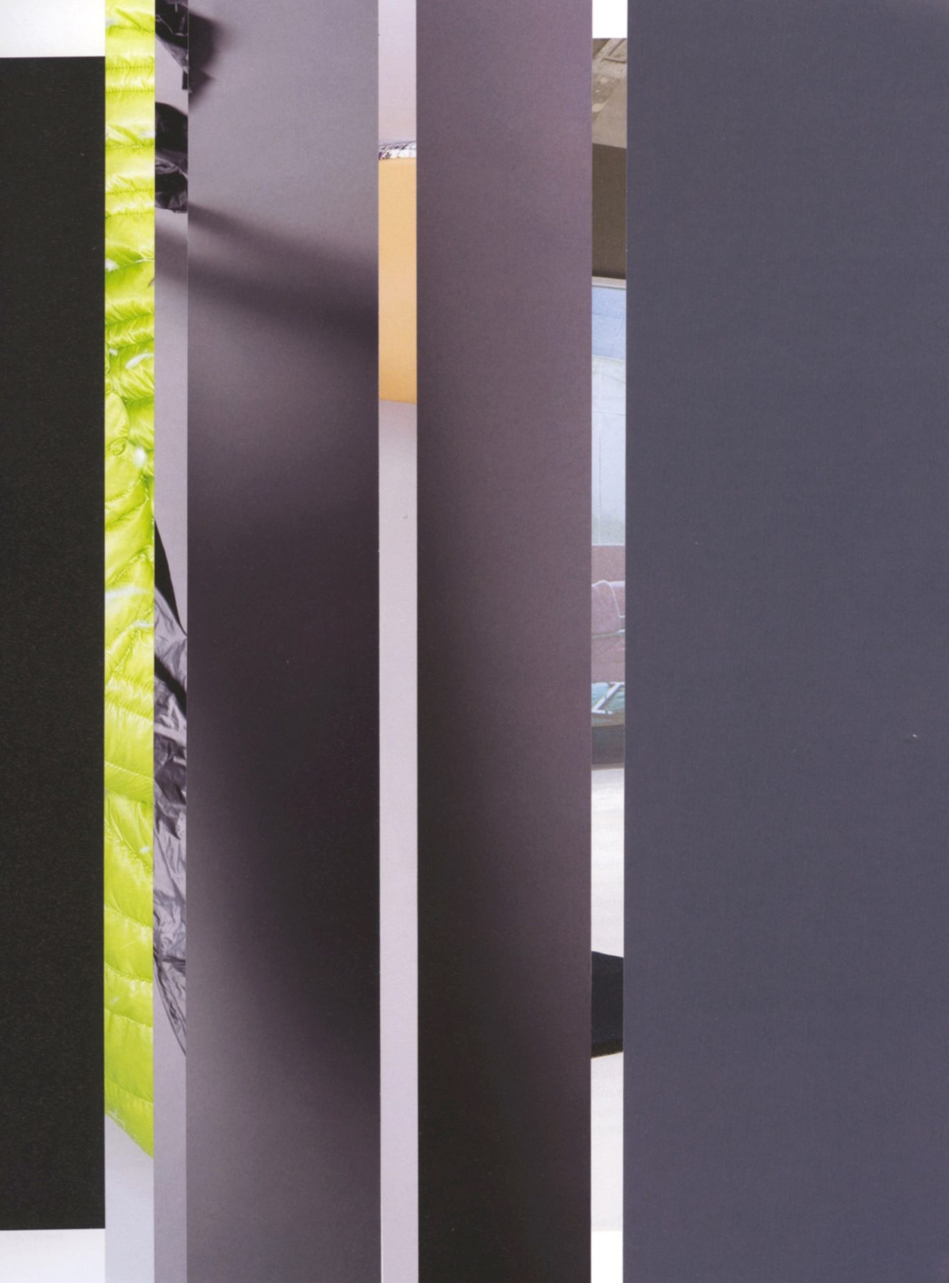 Both the book and the large prints are based on collages that were created between 2017 and 2019. The starting materials are magazines in standard format that have been cut vertically. Based on the technique of classic film editing, a conscious cut was made here “before” the action: Individual characteristics, action, writing, characters and content information were consistently left out.