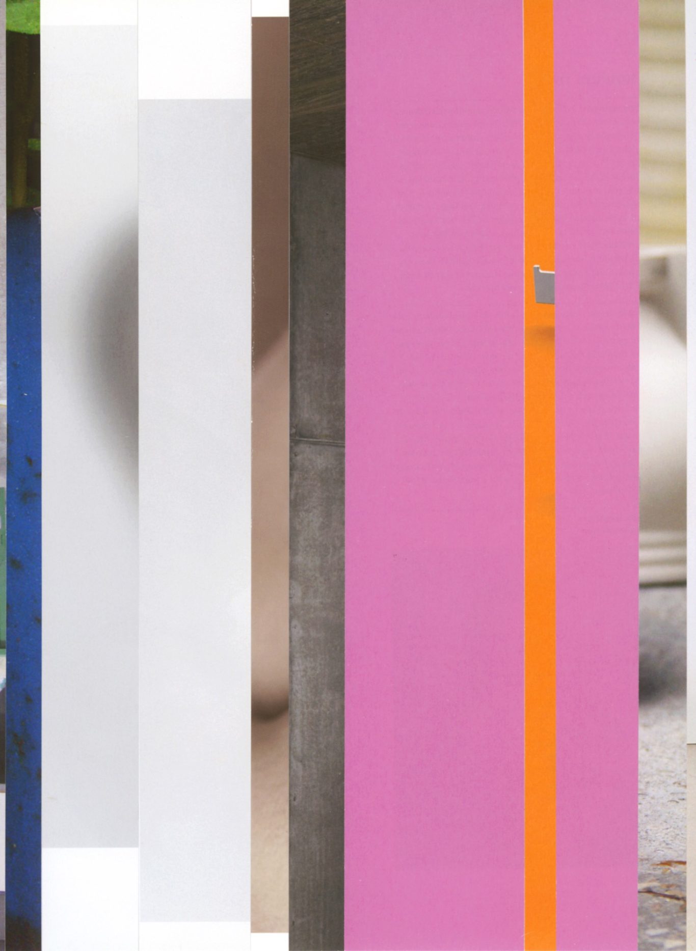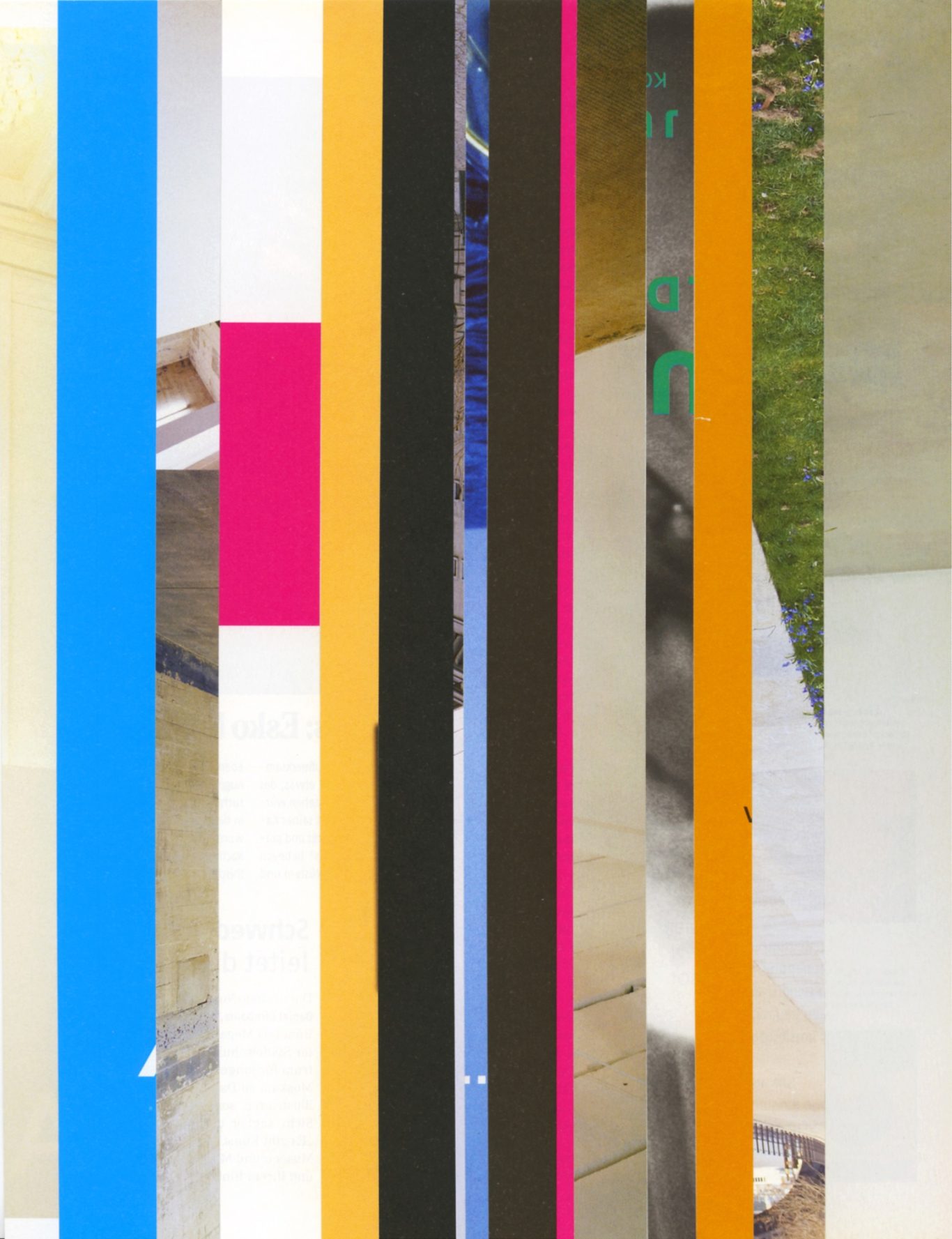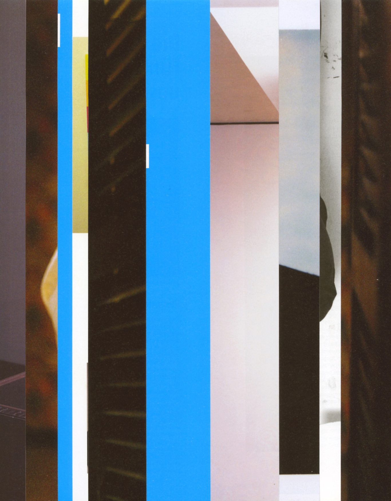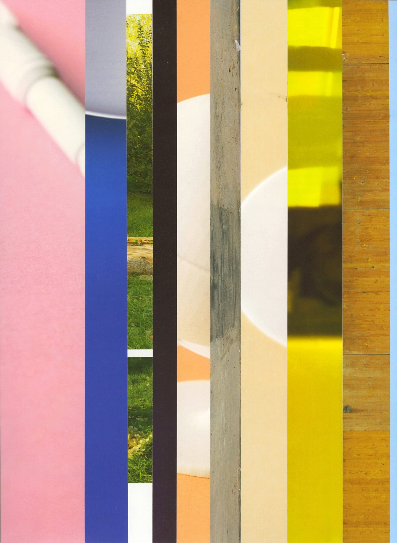 Both the book and the large prints are based on collages that were created between 2017 and 2019. The starting materials are magazines in standard format that have been cut vertically. Based on the technique of classic film editing, a conscious cut was made here “before” the action: Individual characteristics, action, writing, characters and content information were consistently left out.