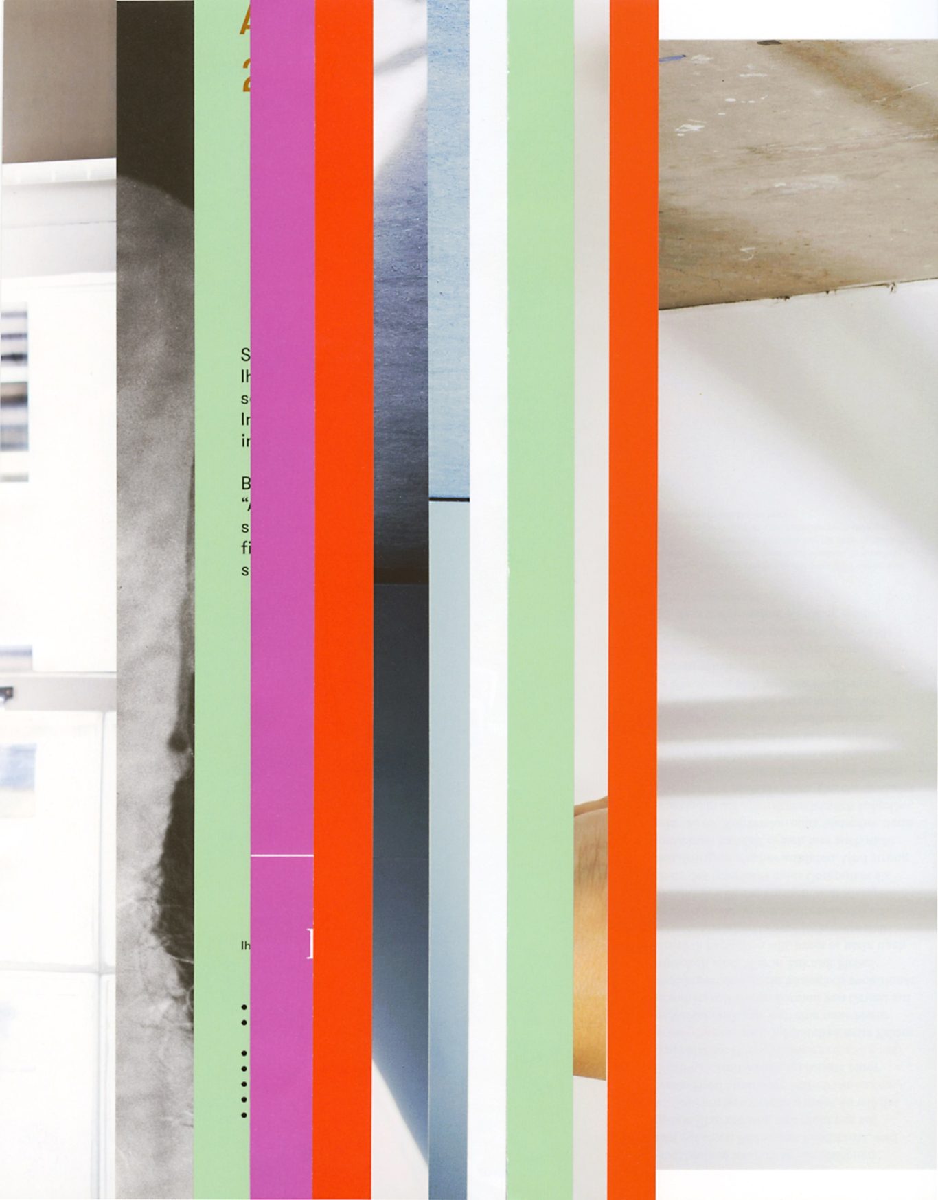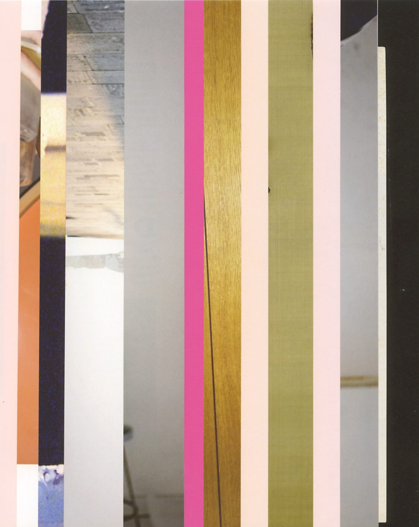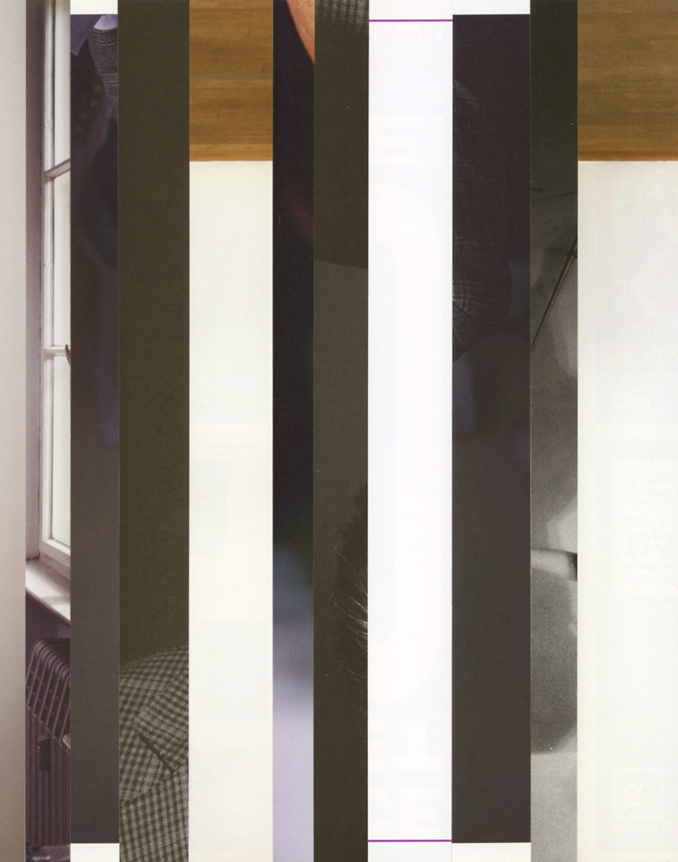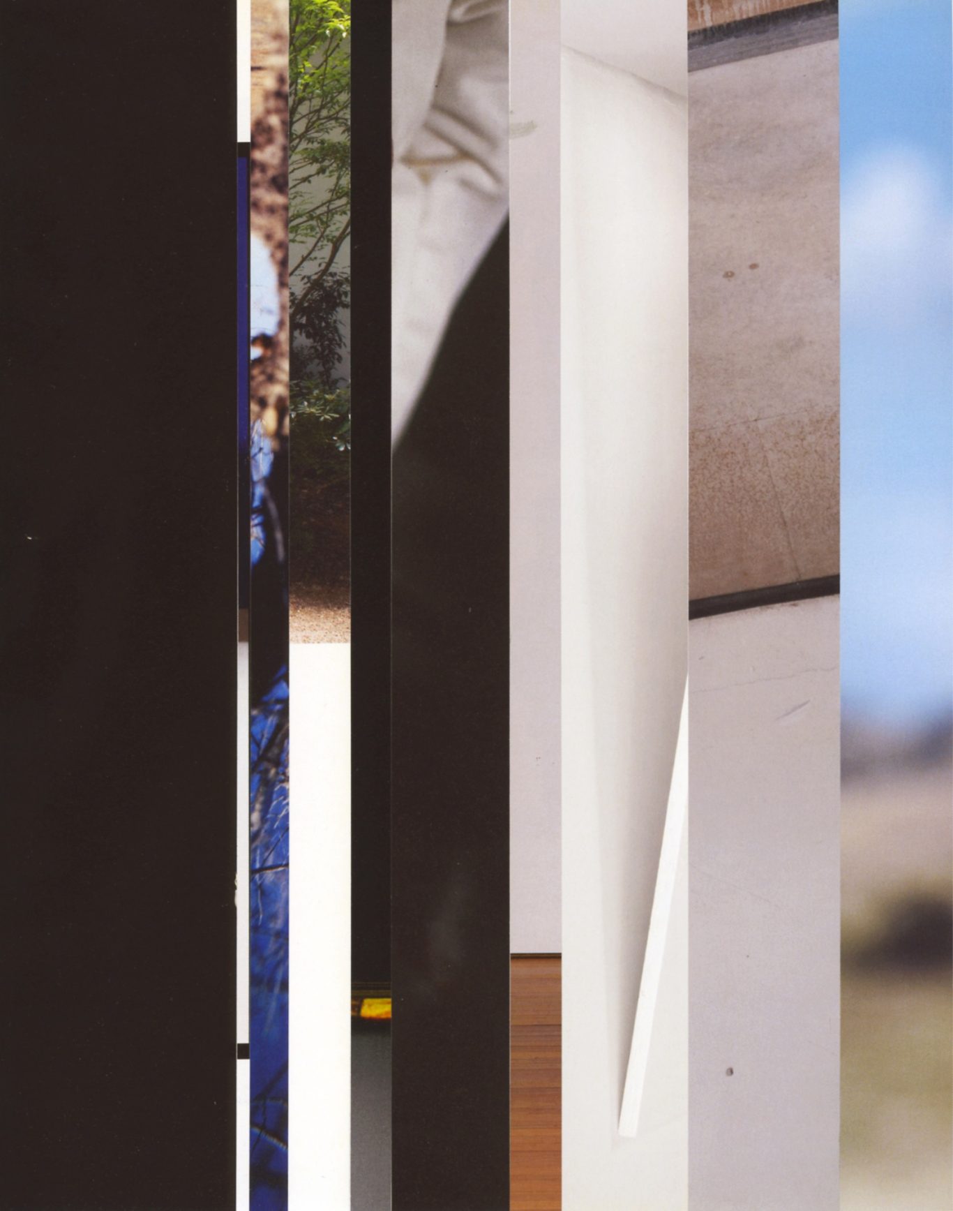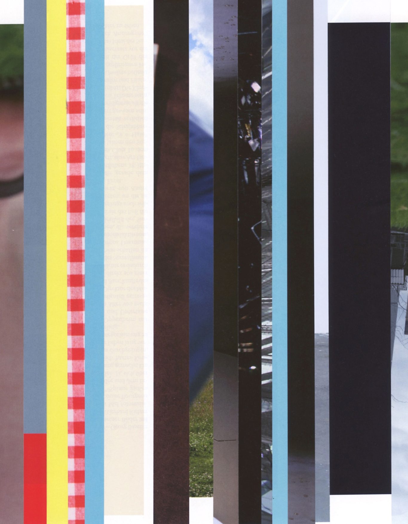 Both the book and the large prints are based on collages that were created between 2017 and 2019. The starting materials are magazines in standard format that have been cut vertically. Based on the technique of classic film editing, a conscious cut was made here “before” the action: Individual characteristics, action, writing, characters and content information were consistently left out.