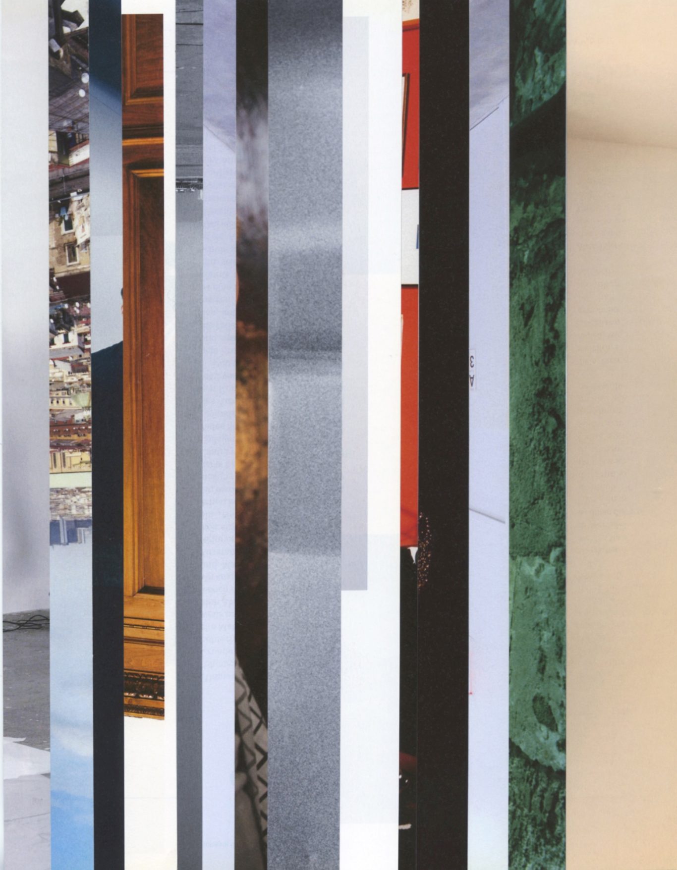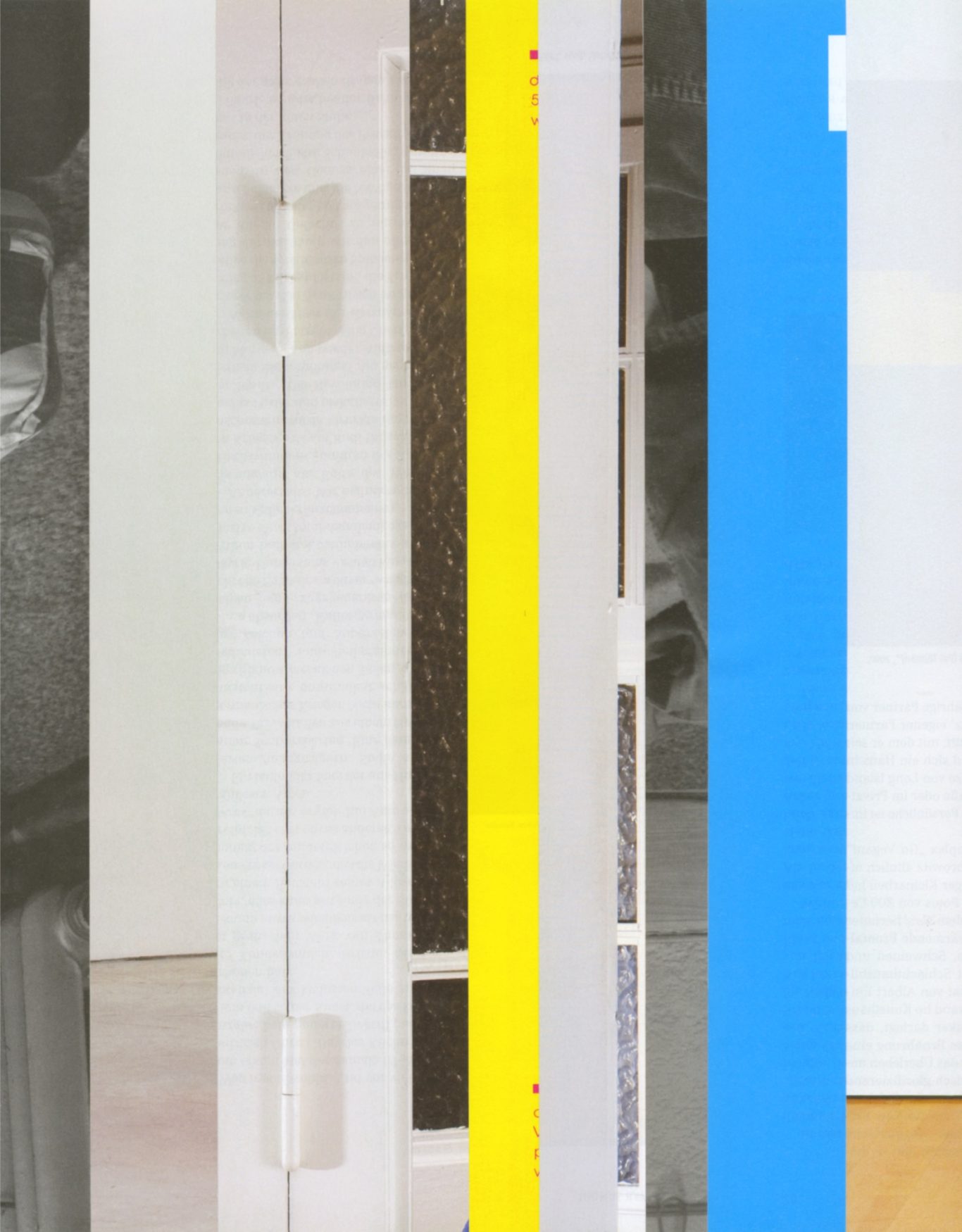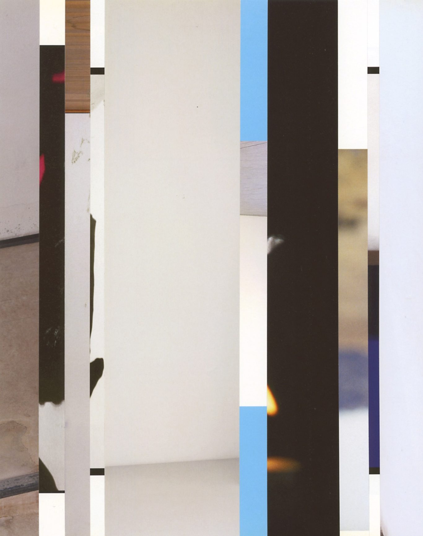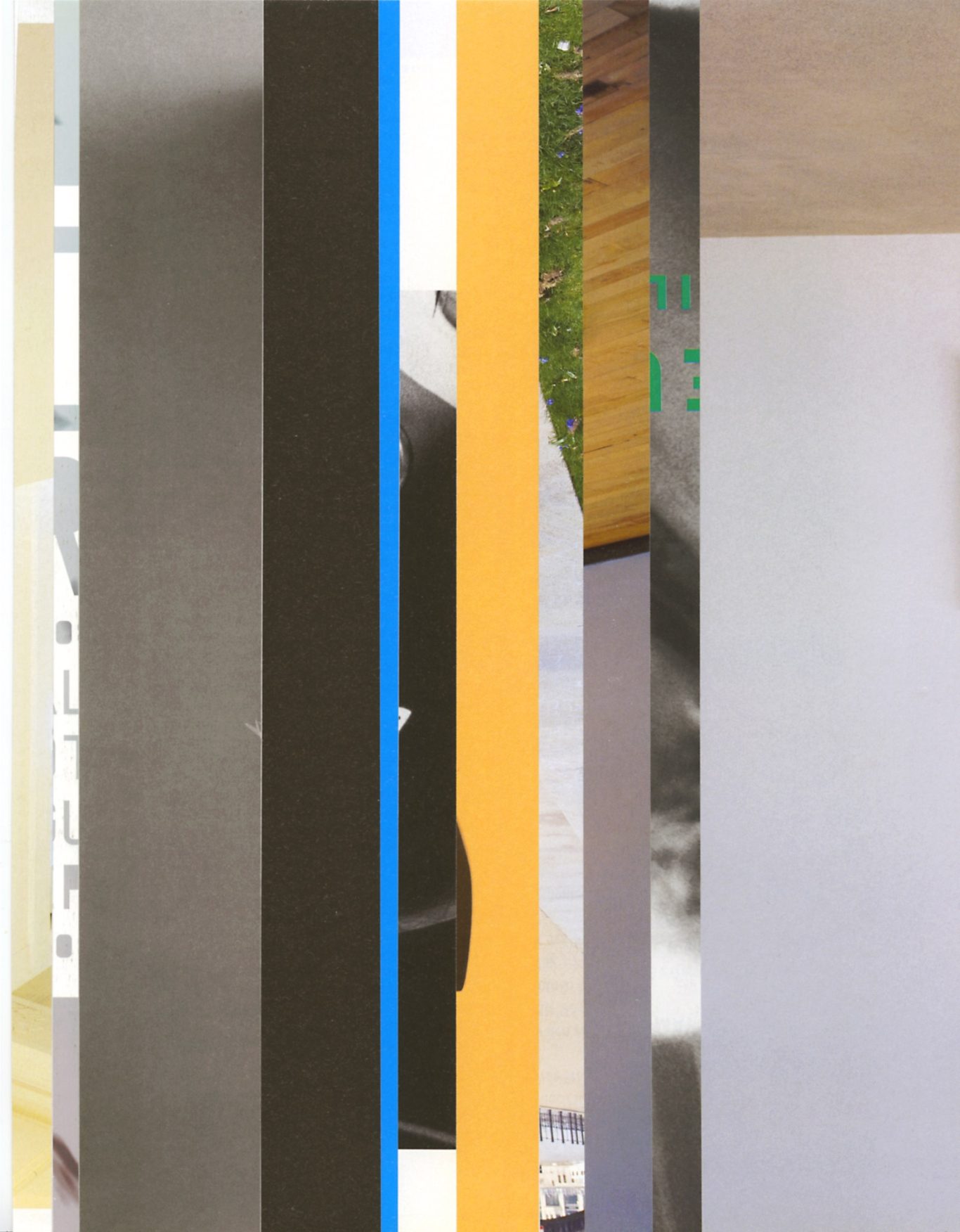 Both the book and the large prints are based on collages that were created between 2017 and 2019. The starting materials are magazines in standard format that have been cut vertically. Based on the technique of classic film editing, a conscious cut was made here “before” the action: Individual characteristics, action, writing, characters and content information were consistently left out.