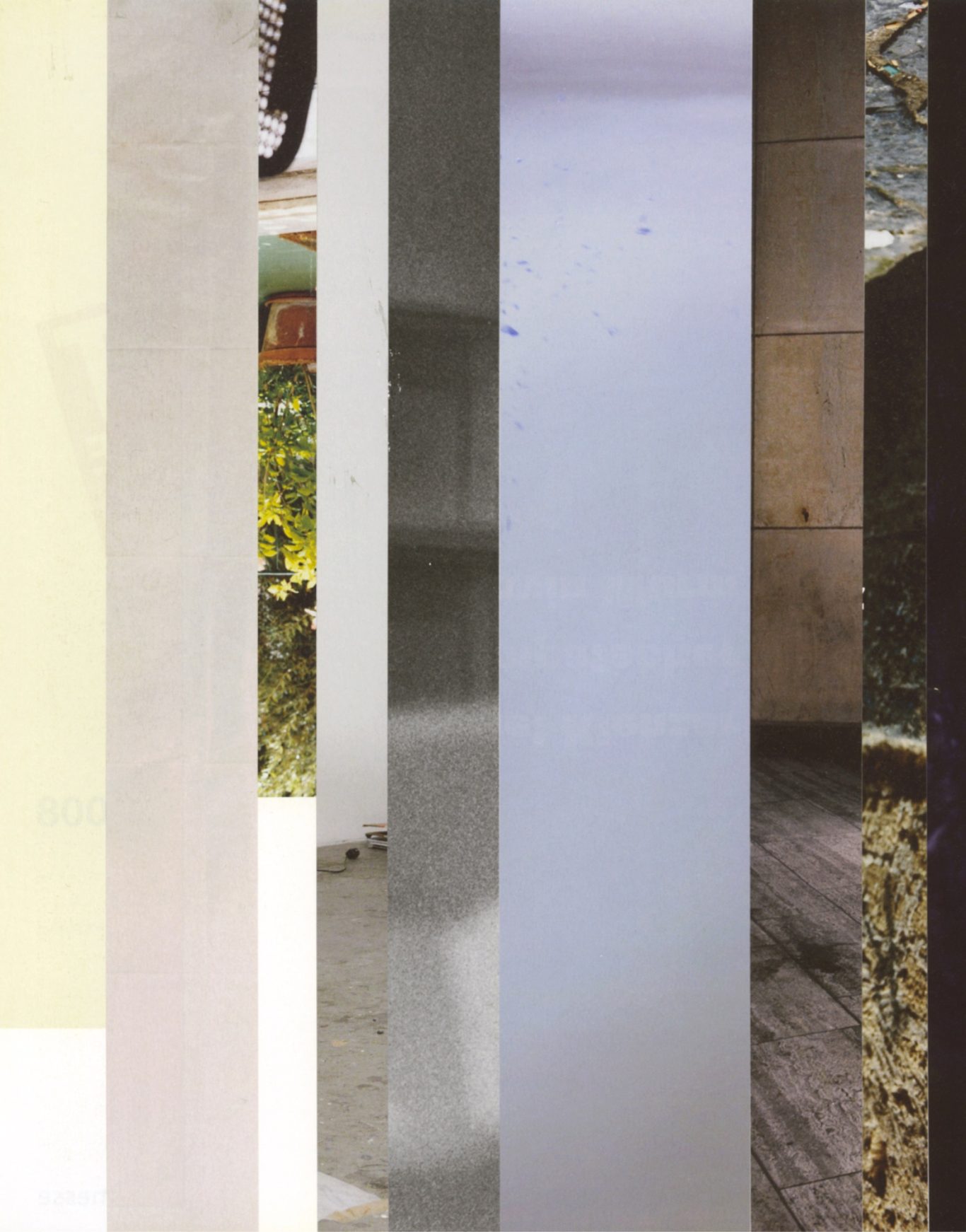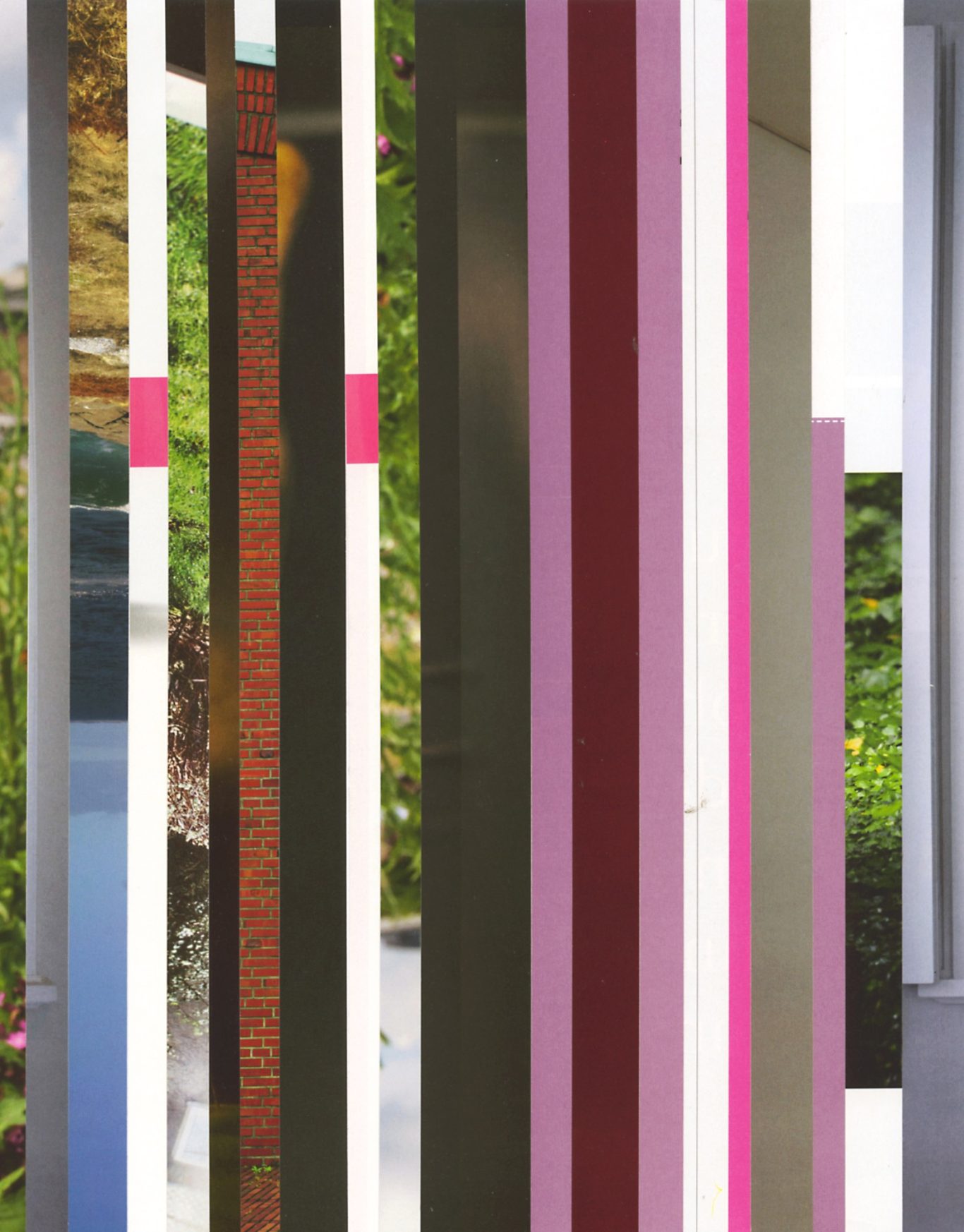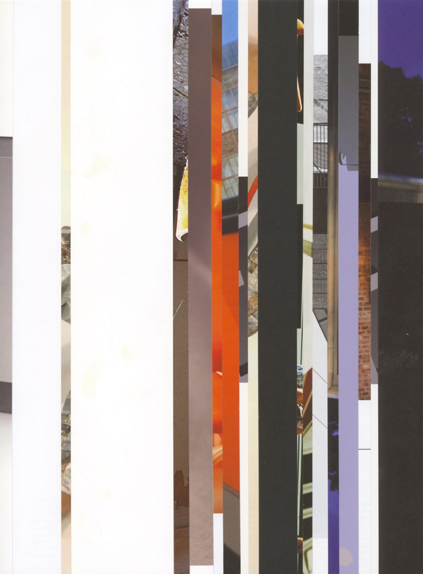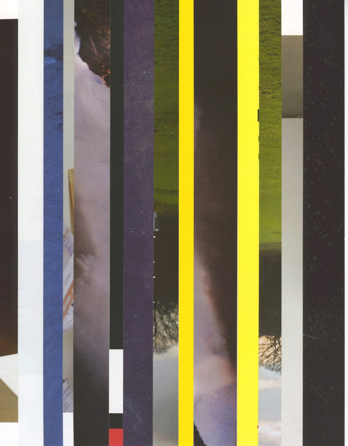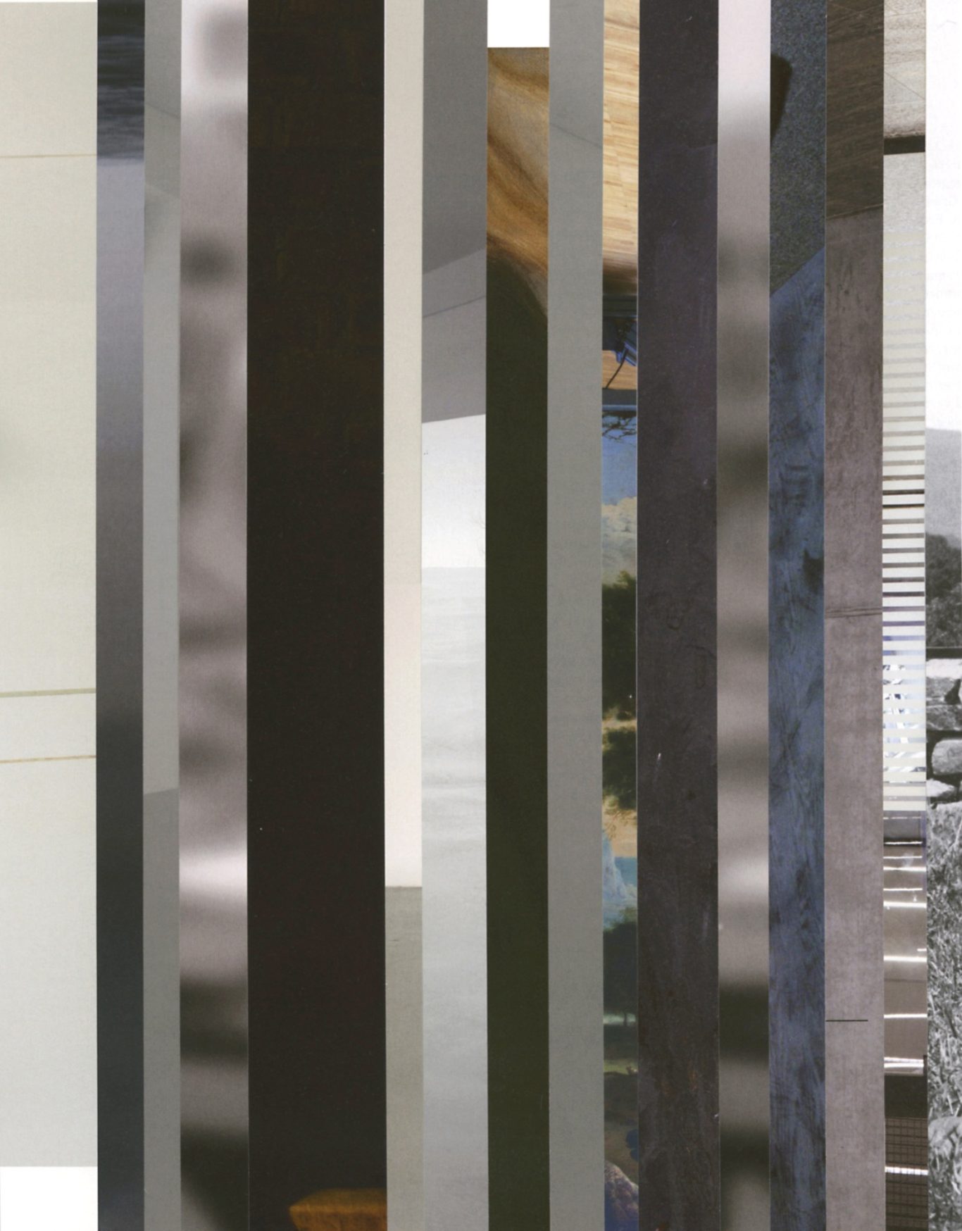 Both the book and the large prints are based on collages that were created between 2017 and 2019. The starting materials are magazines in standard format that have been cut vertically. Based on the technique of classic film editing, a conscious cut was made here “before” the action: Individual characteristics, action, writing, characters and content information were consistently left out.