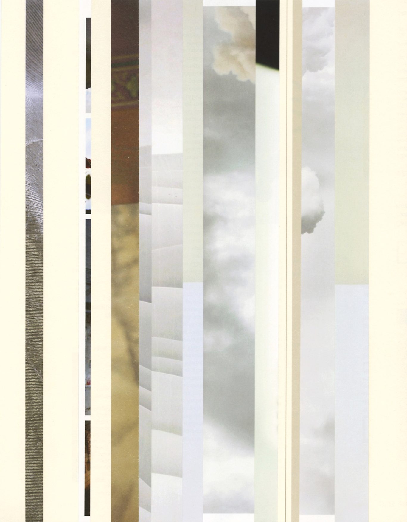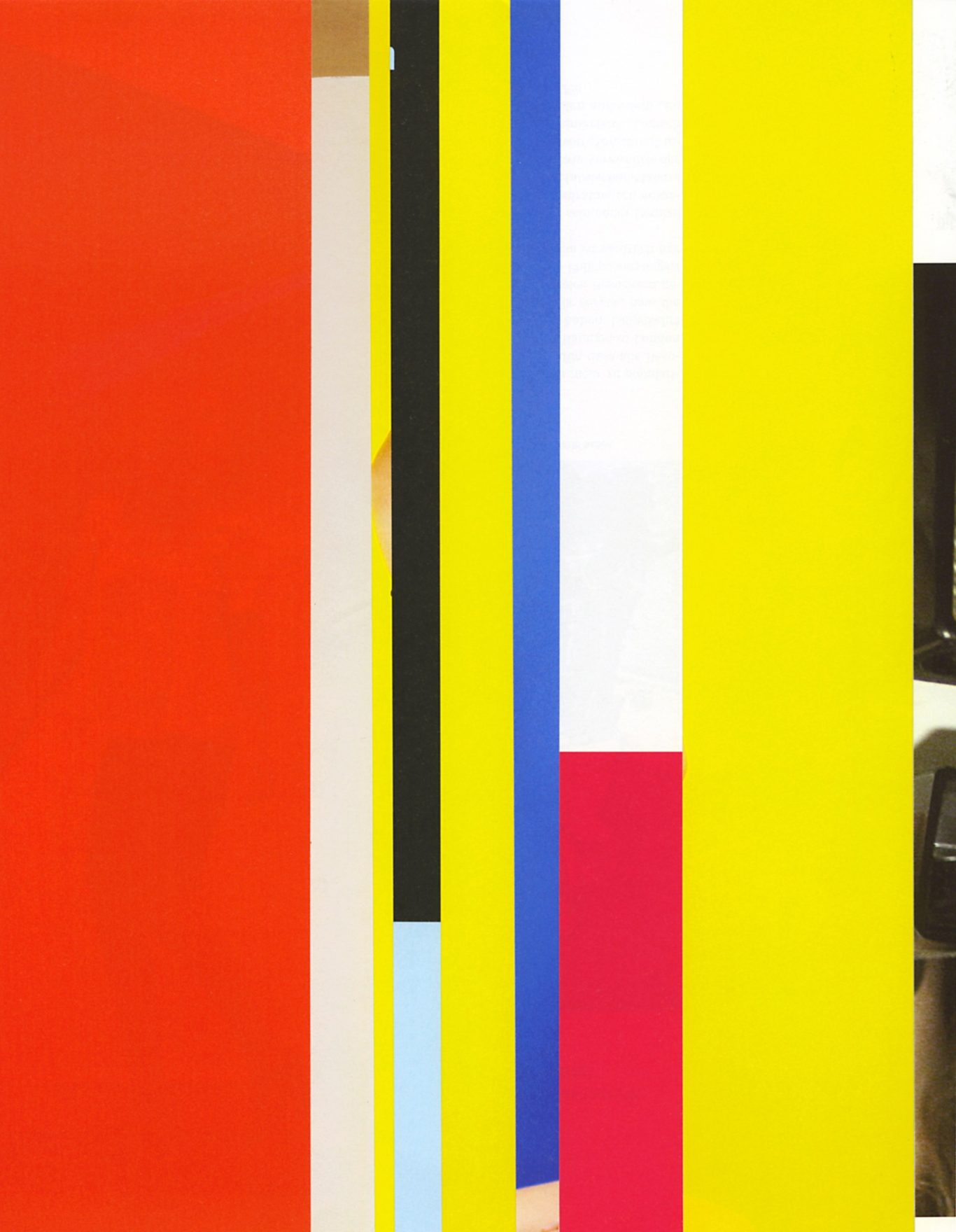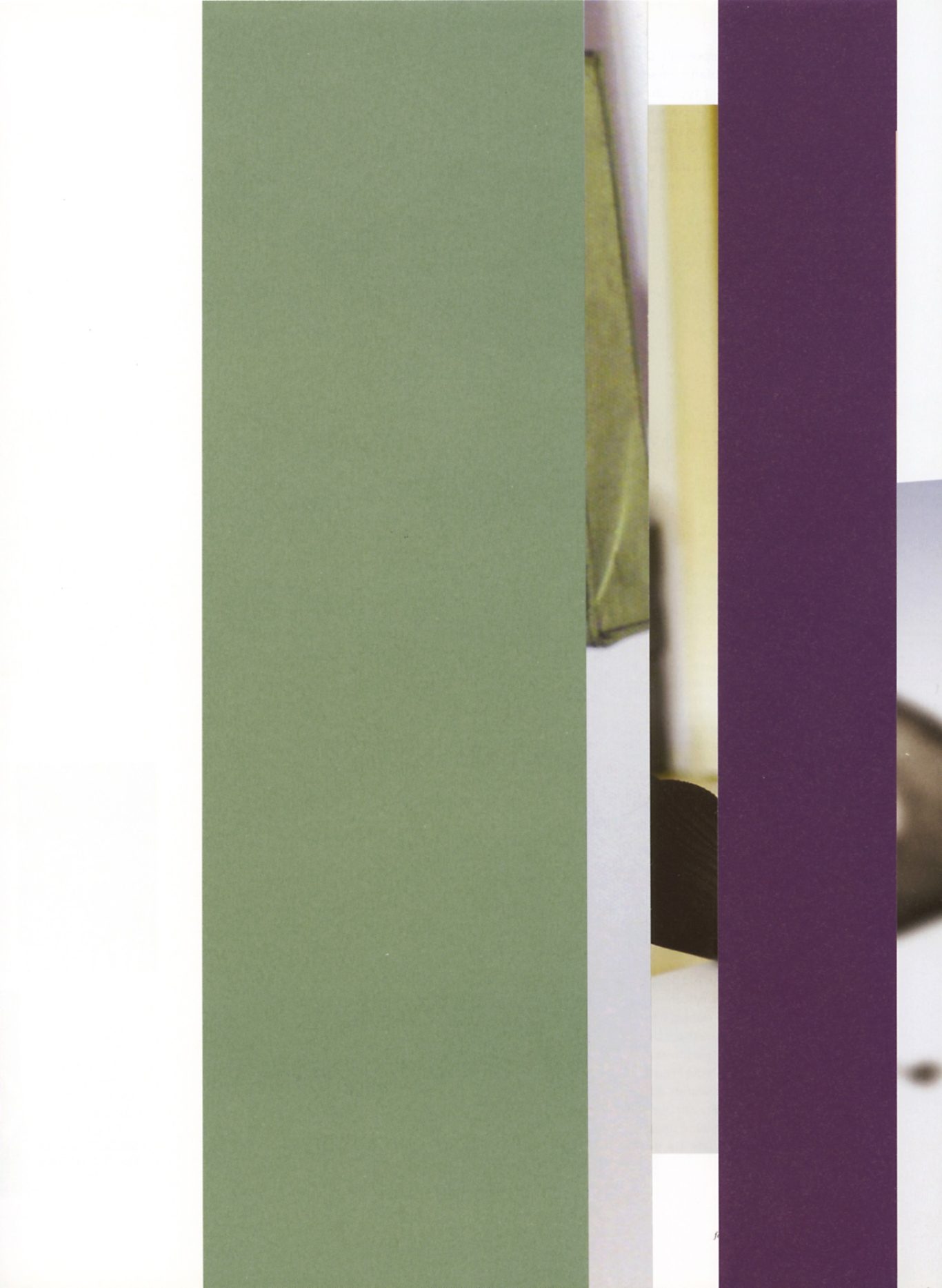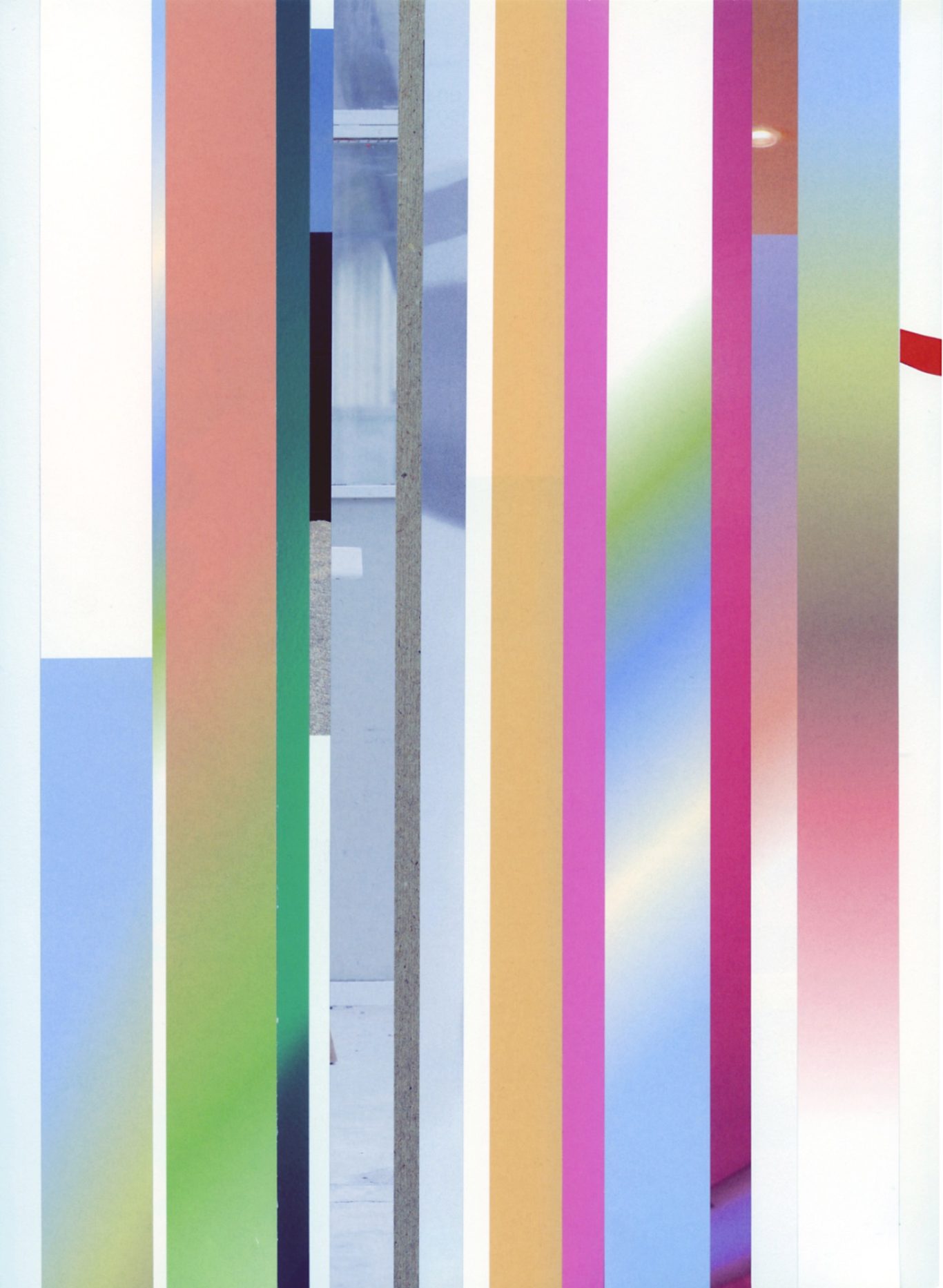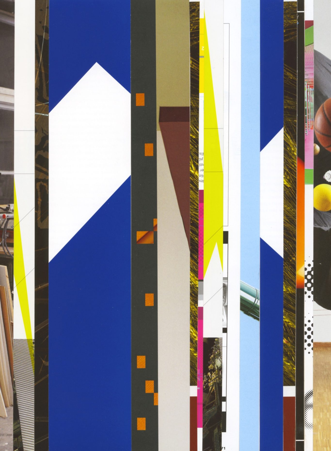 Both the book and the large prints are based on collages that were created between 2017 and 2019. The starting materials are magazines in standard format that have been cut vertically. Based on the technique of classic film editing, a conscious cut was made here “before” the action: Individual characteristics, action, writing, characters and content information were consistently left out.