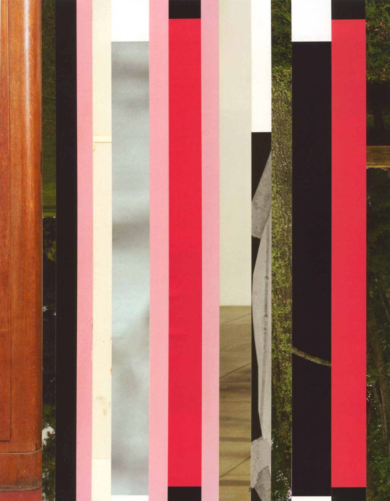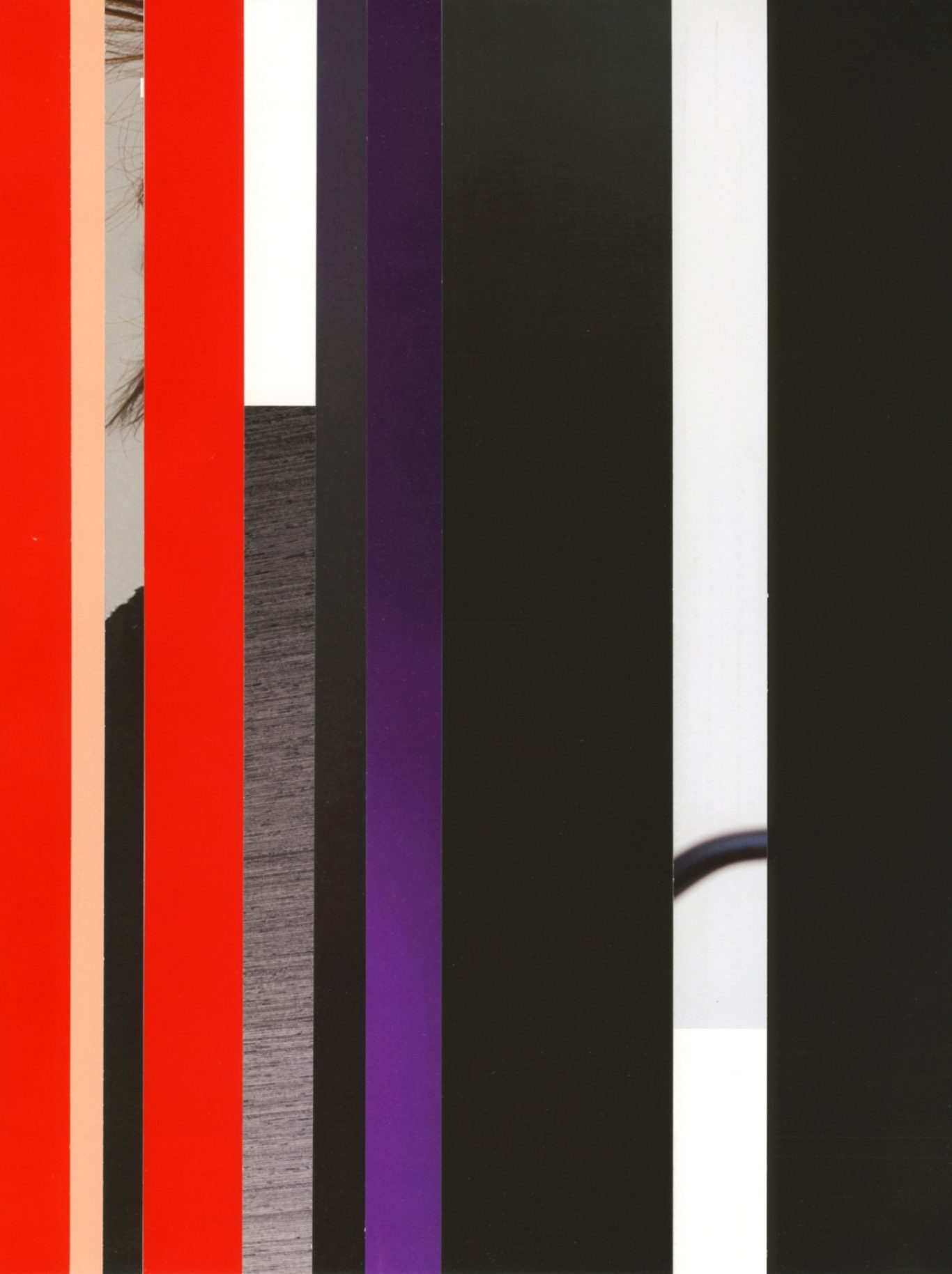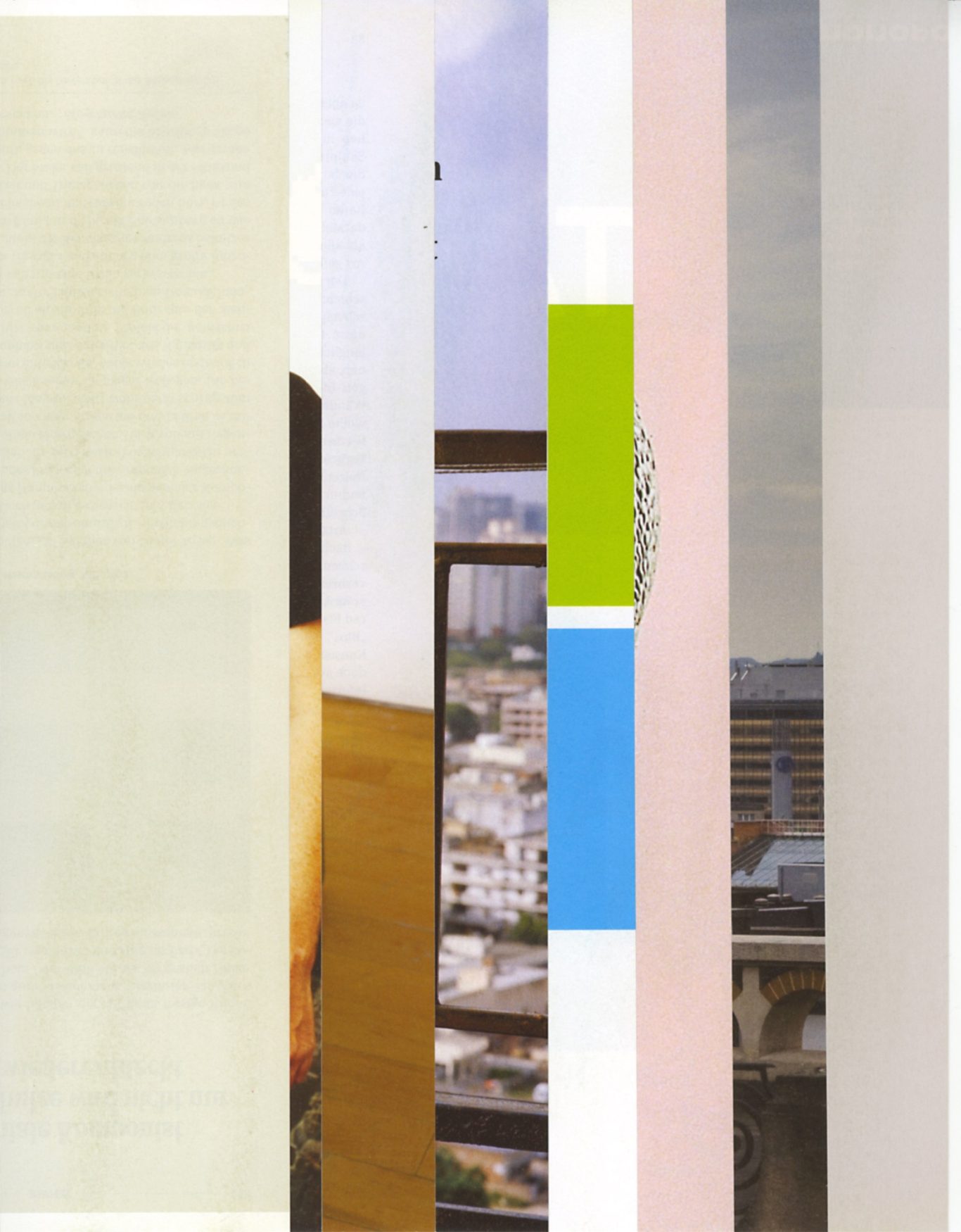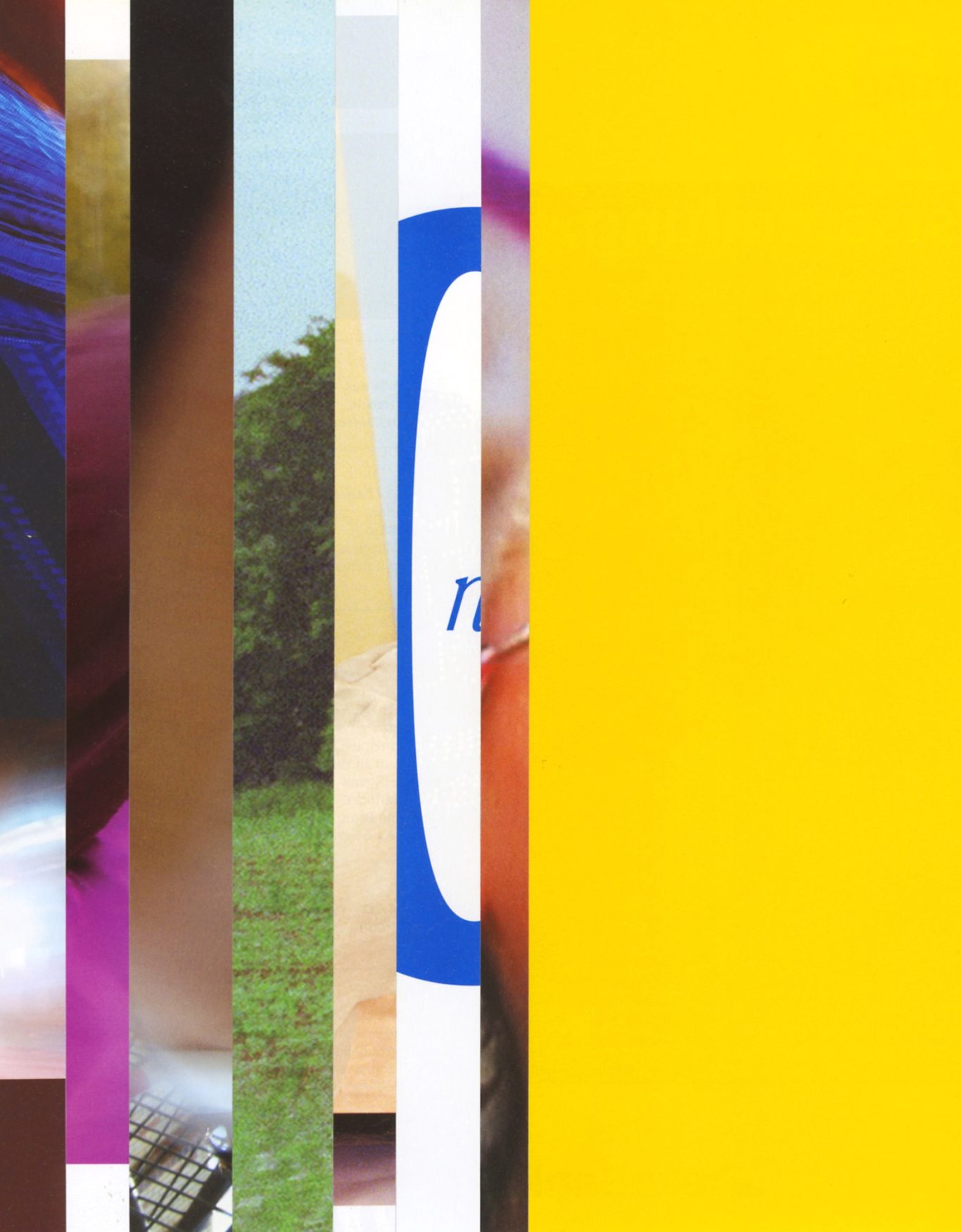Both the book and the large prints are based on collages that were created between 2017 and 2019. The starting materials are magazines in standard format that have been cut vertically. Based on the technique of classic film editing, a conscious cut was made here “before” the action: Individual characteristics, action, writing, characters and content information were consistently left out.