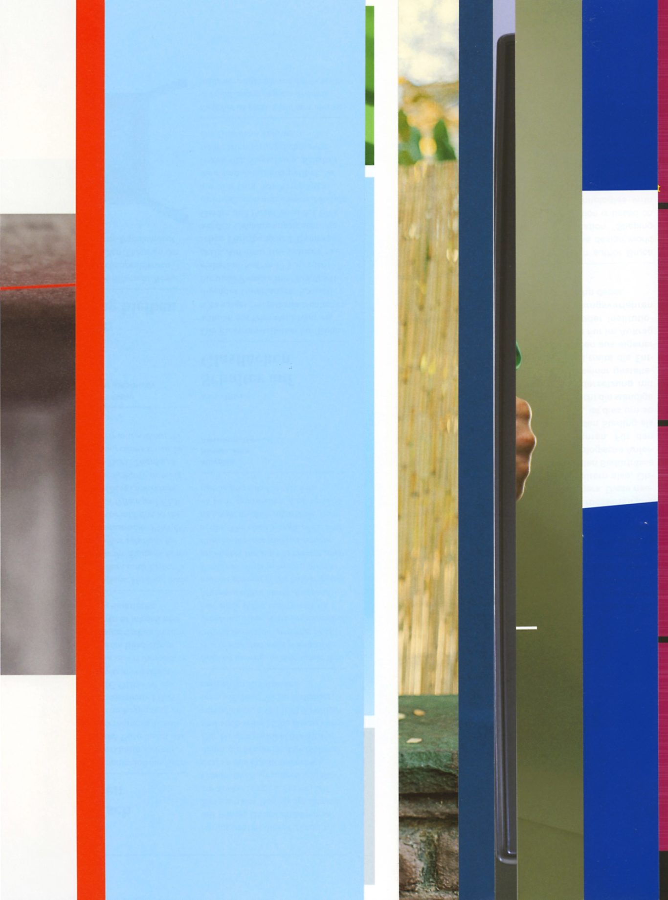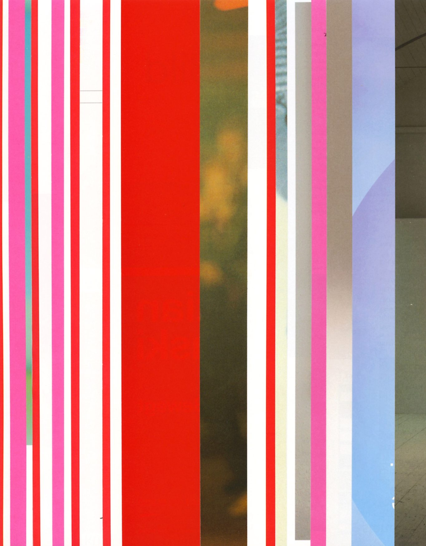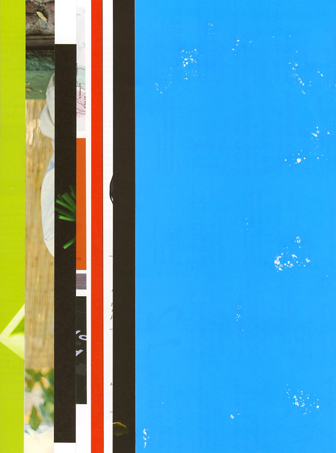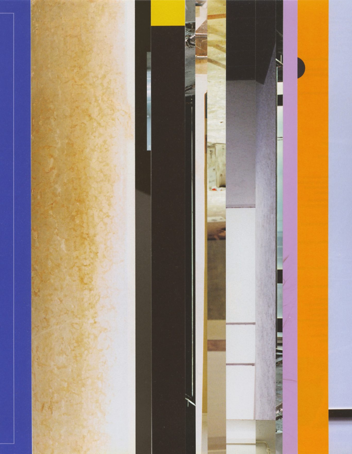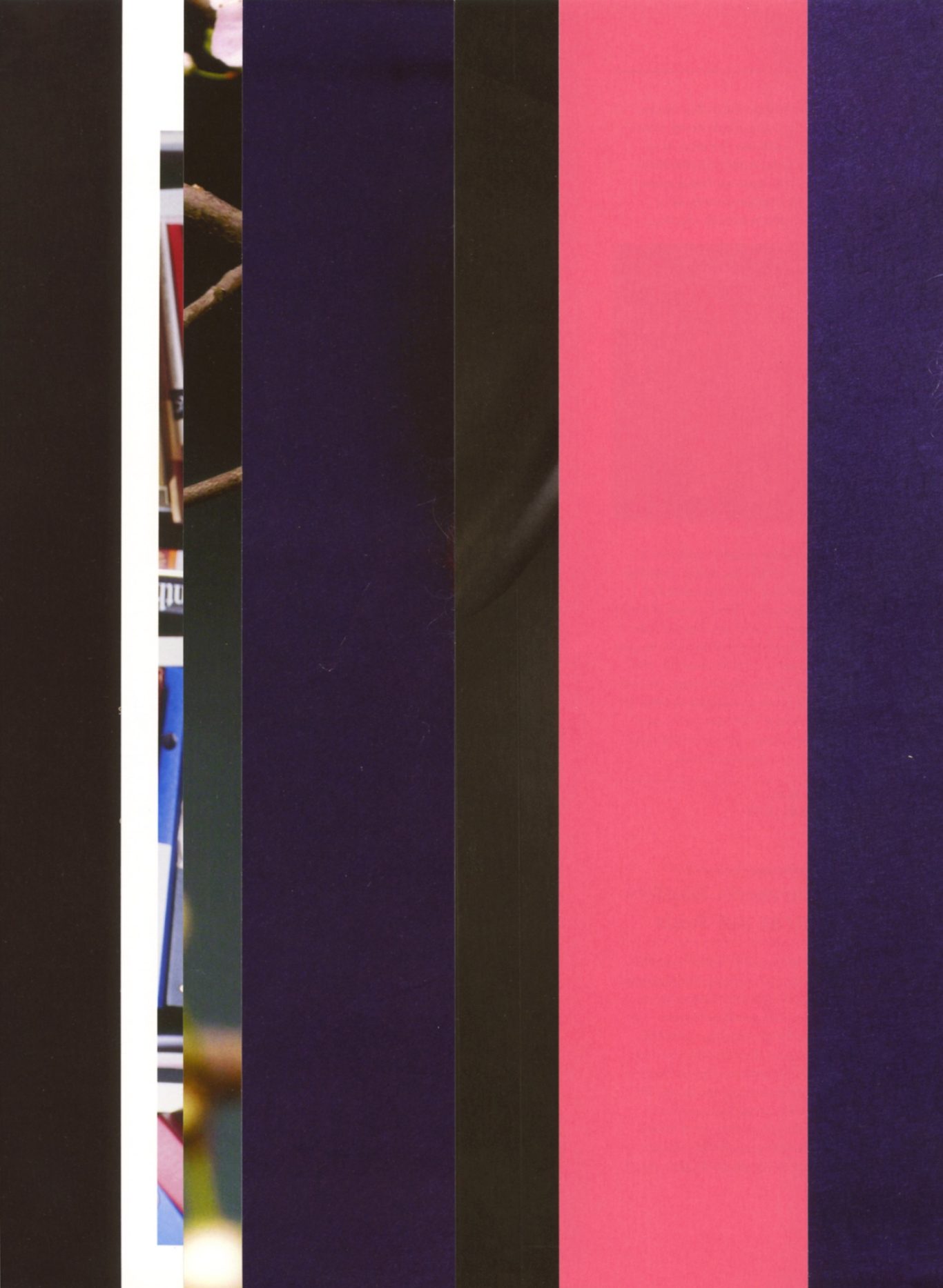 Both the book and the large prints are based on collages that were created between 2017 and 2019. The starting materials are magazines in standard format that have been cut vertically. Based on the technique of classic film editing, a conscious cut was made here “before” the action: Individual characteristics, action, writing, characters and content information were consistently left out.