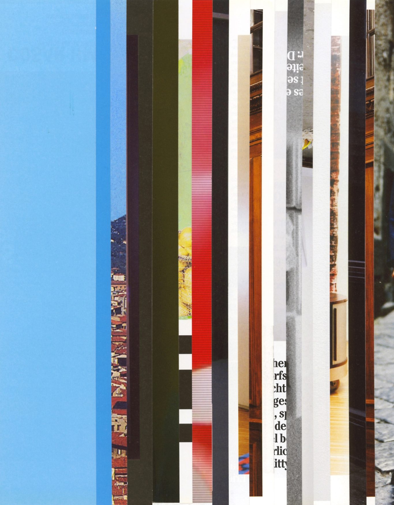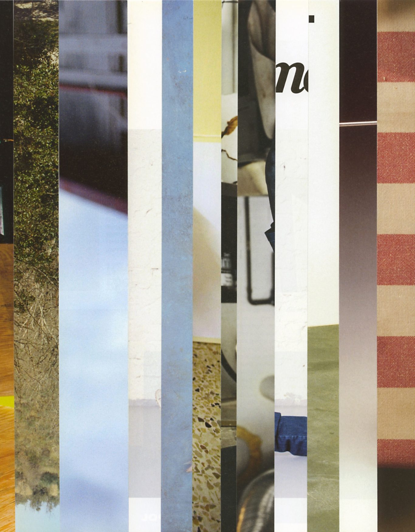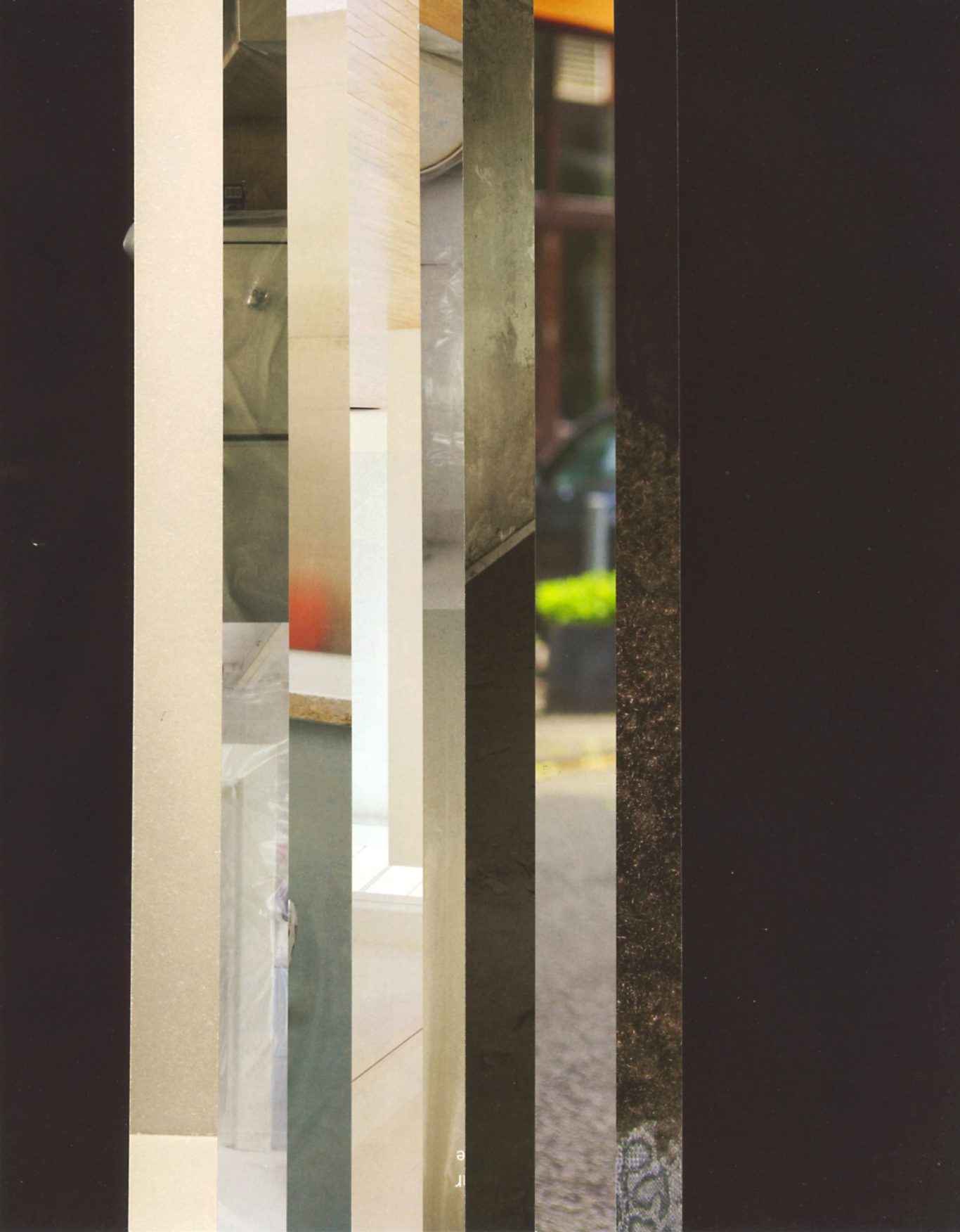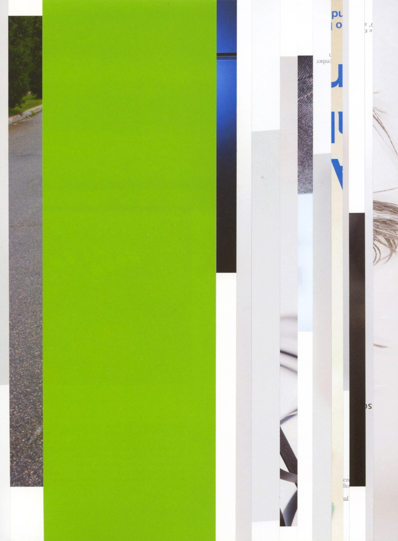 Ausgangsmaterial sind vertikal geschnittene Zeitschriften im Standardformat. Angelehnt an die Technik des klassischen Filmschnitts wurde hier bewusst „vor“ der Handlung geschnitten: Einzelne Merkmale, Handlung, Schrift, Figuren und inhaltliche Informationen wurden konsequent weggelassen.