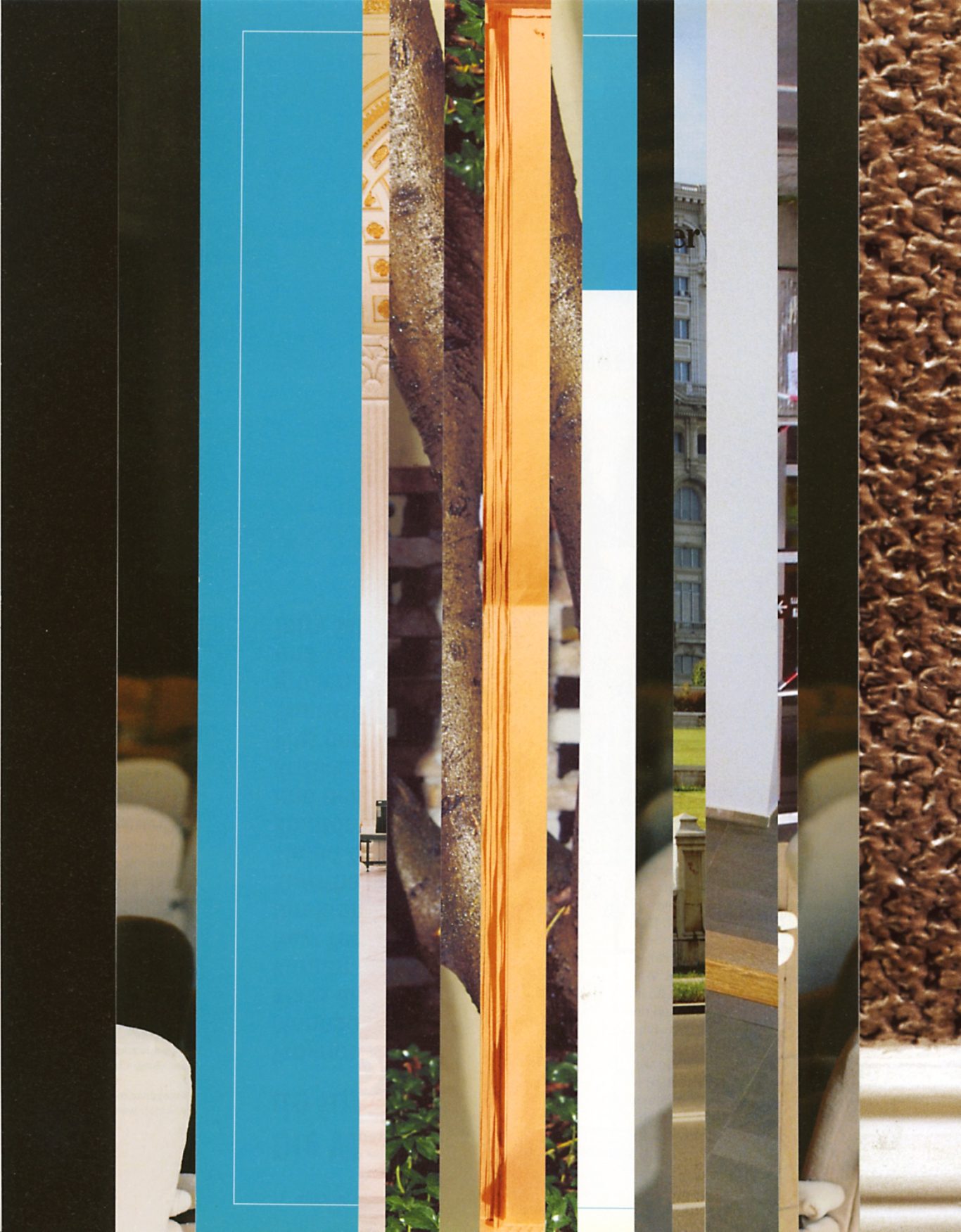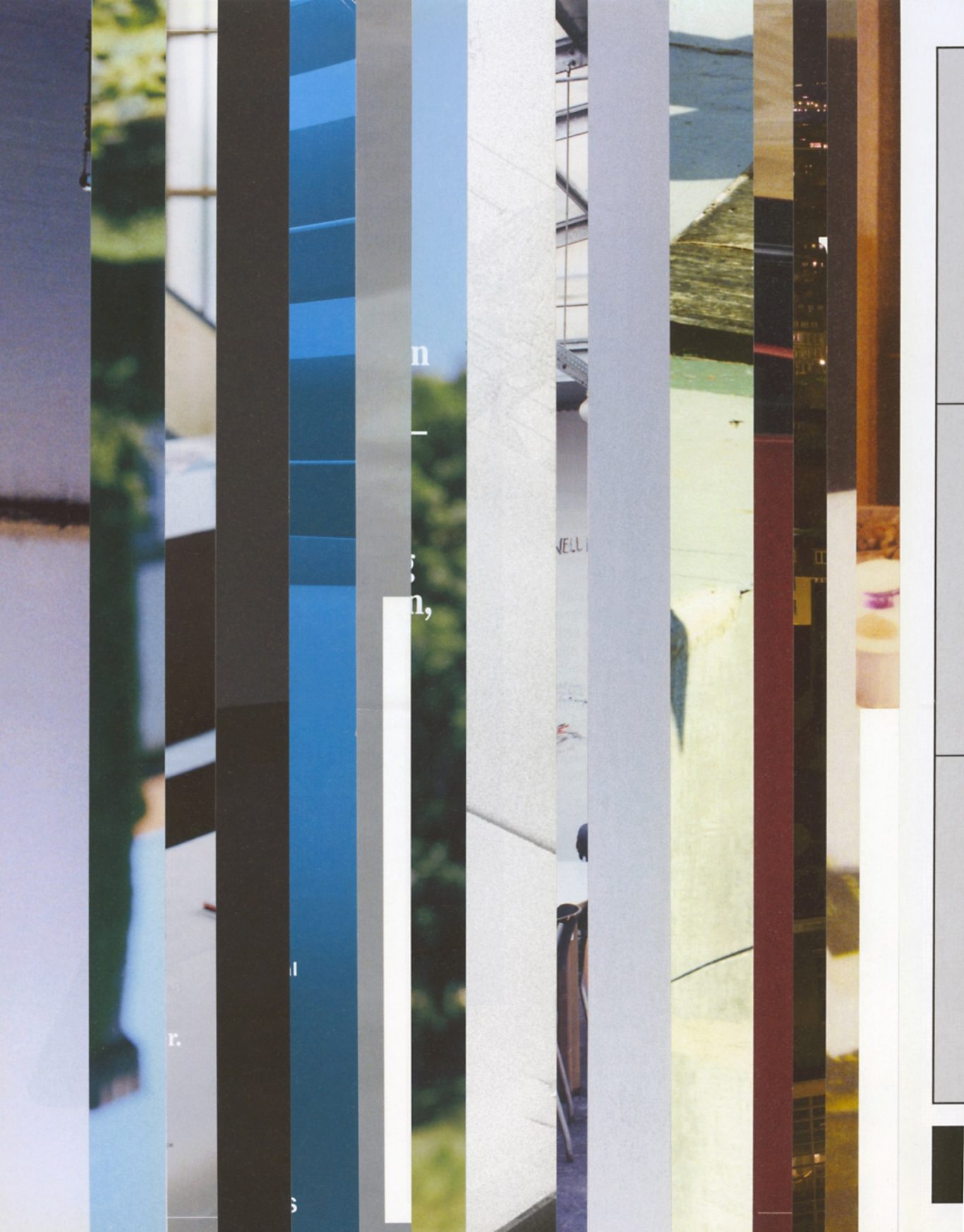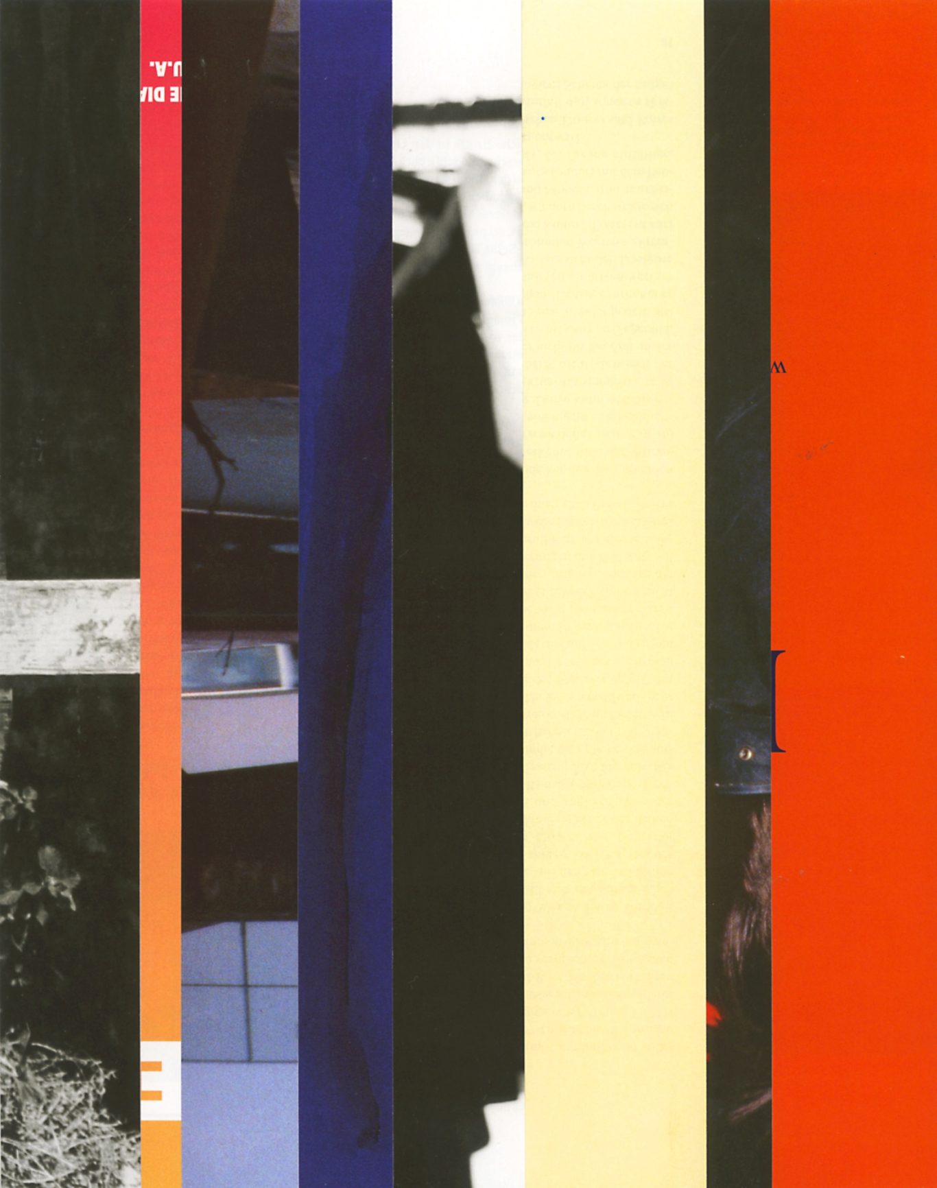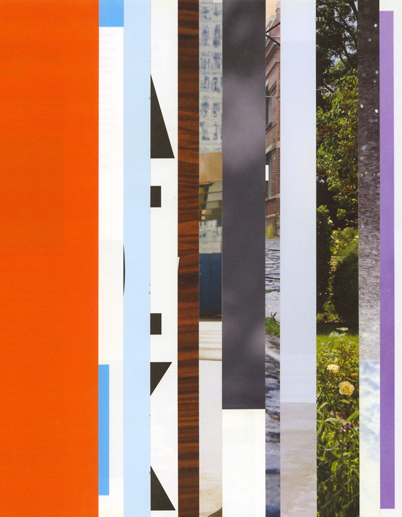 Ausgangsmaterial sind vertikal geschnittene Zeitschriften im Standardformat. Angelehnt an die Technik des klassischen Filmschnitts wurde hier bewusst „vor“ der Handlung geschnitten: Einzelne Merkmale, Handlung, Schrift, Figuren und inhaltliche Informationen wurden konsequent weggelassen.