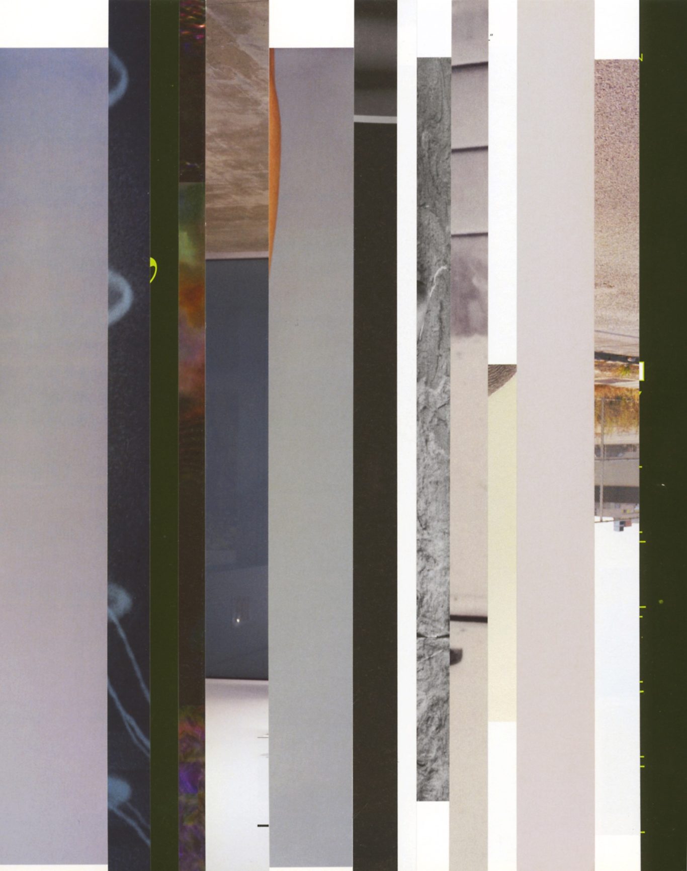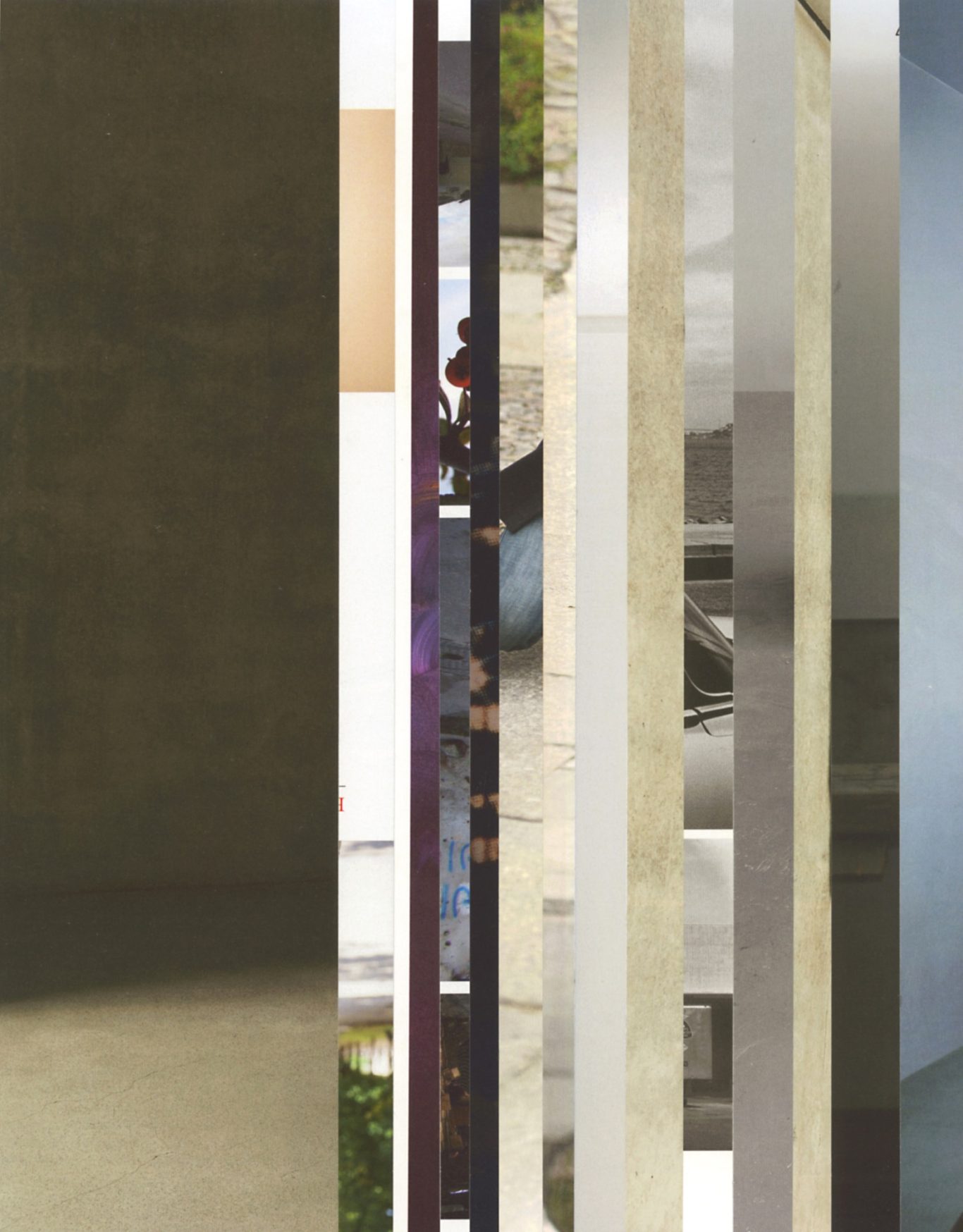 In the creation process of the horizontal montage, the individual supposedly neutral elements enter into an unforeseeable interaction. From the trivial layering of individual layers, aesthetically charged conglomerates emerge, independent atmospheres or systems form, which simulate a kind of "legibility" or rhythm to the viewer.
